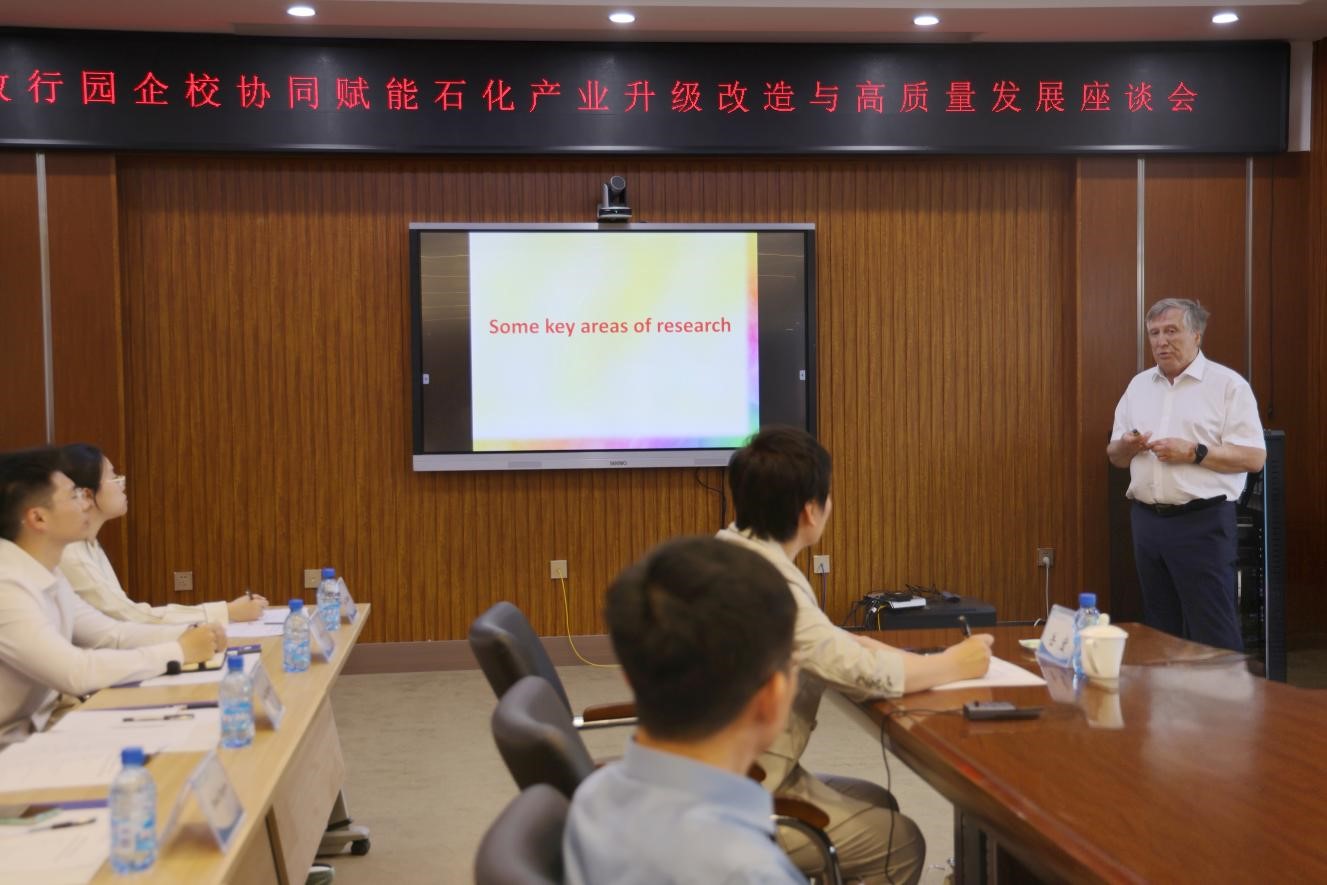 政行园企校各方代表围绕协同赋能石化产业升级改造与高质量发展、协同创新机制、人才培养模式、技术攻关方向等议题展开深入讨论。辽宁石化职业技术学院副校长杨连成以《基于微反应和离子液体催化技术的化工生产新工艺》为题、应用化学系副主任刘淼以《非粮碳源取代玉米淀粉发酵生产丁二酸的条件优化》为题、石油化工系青年教师李泽林以《二氧化钛光催化材料的改性策略与光催化效率提升研究》为题交流了技术攻关方向及科研成果。