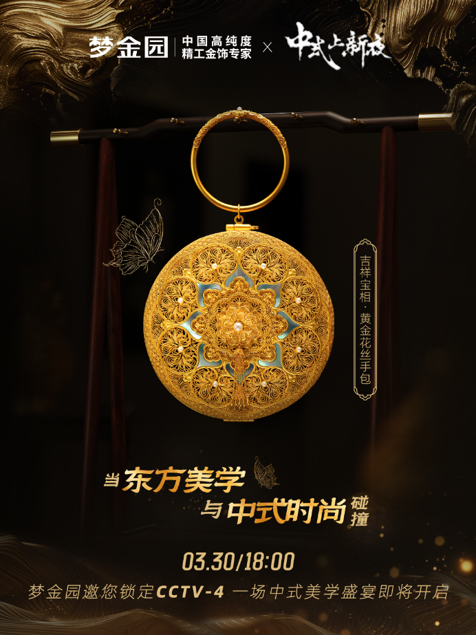在2025年央视大型时尚文化节目《中式上新夜》中,梦金园以“非遗花丝工艺+现代设计”的创新融合从几百件作品中脱颖而出,吉祥宝相花丝手包、翠羽宫扇、一路相伴小鹿挎包等亮相央视舞台,向世界展示了中国传统工艺的当代价值。表达出新中式不仅是服饰和珠宝的革新,更是传统文化自信的觉醒。