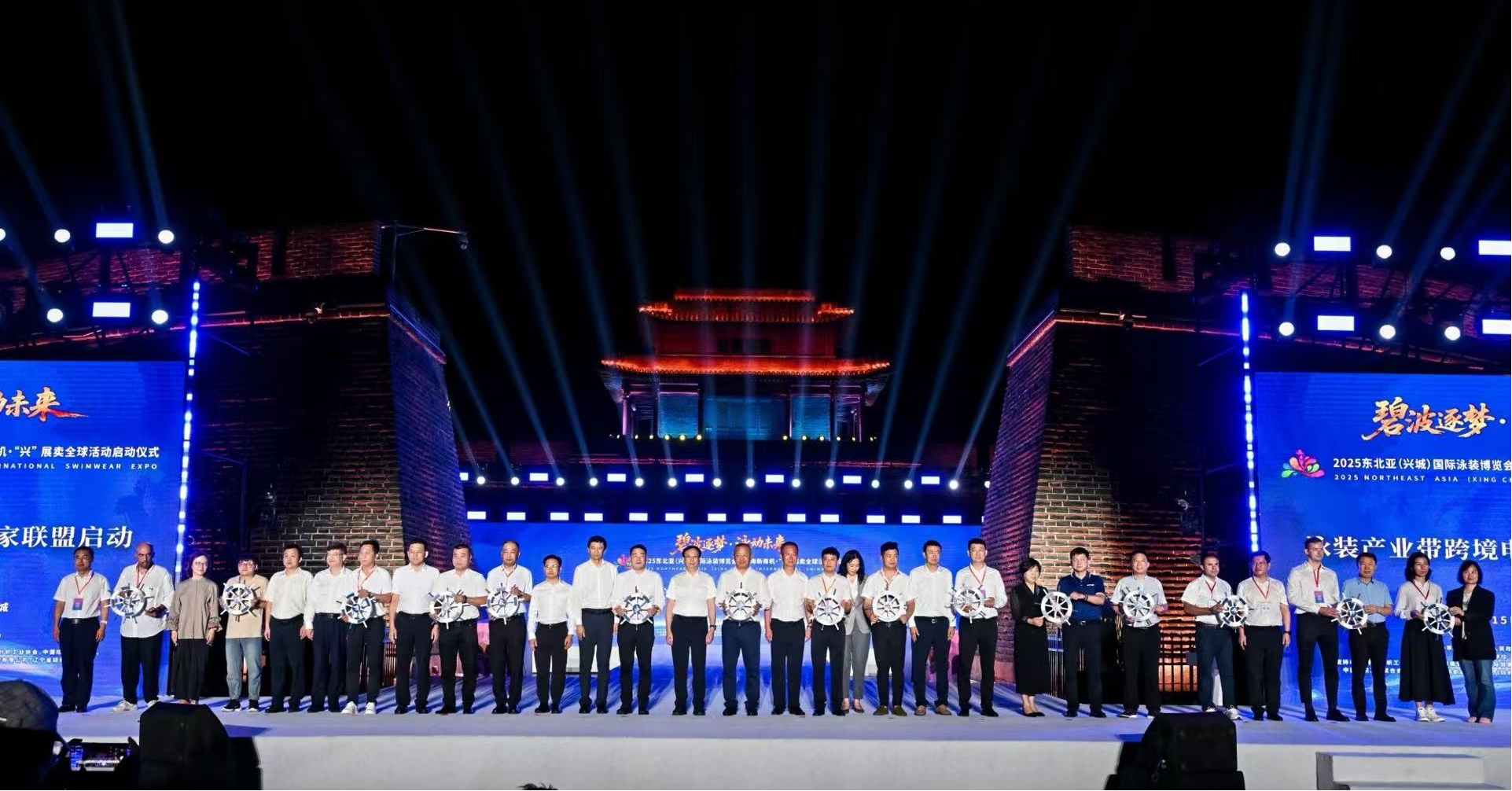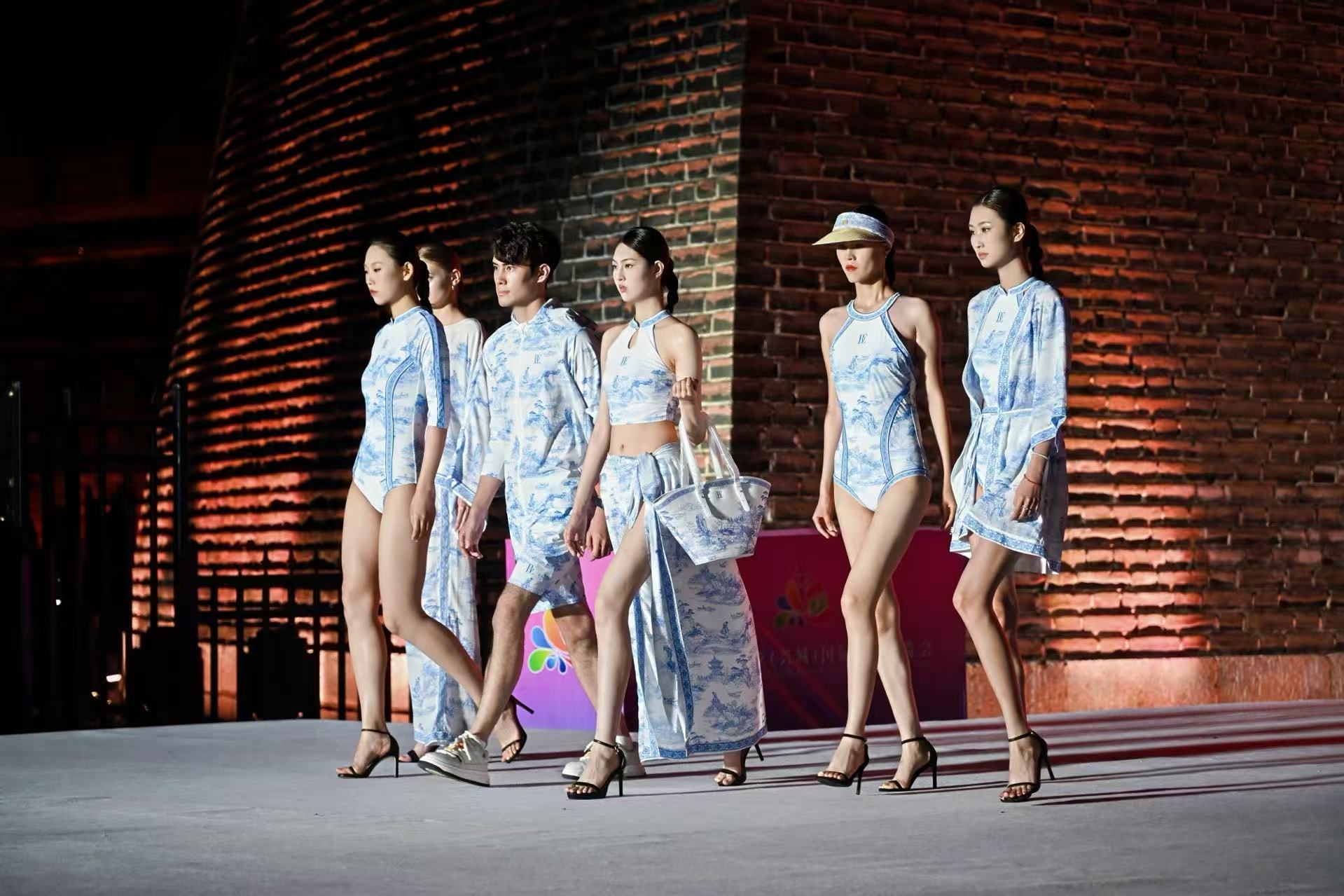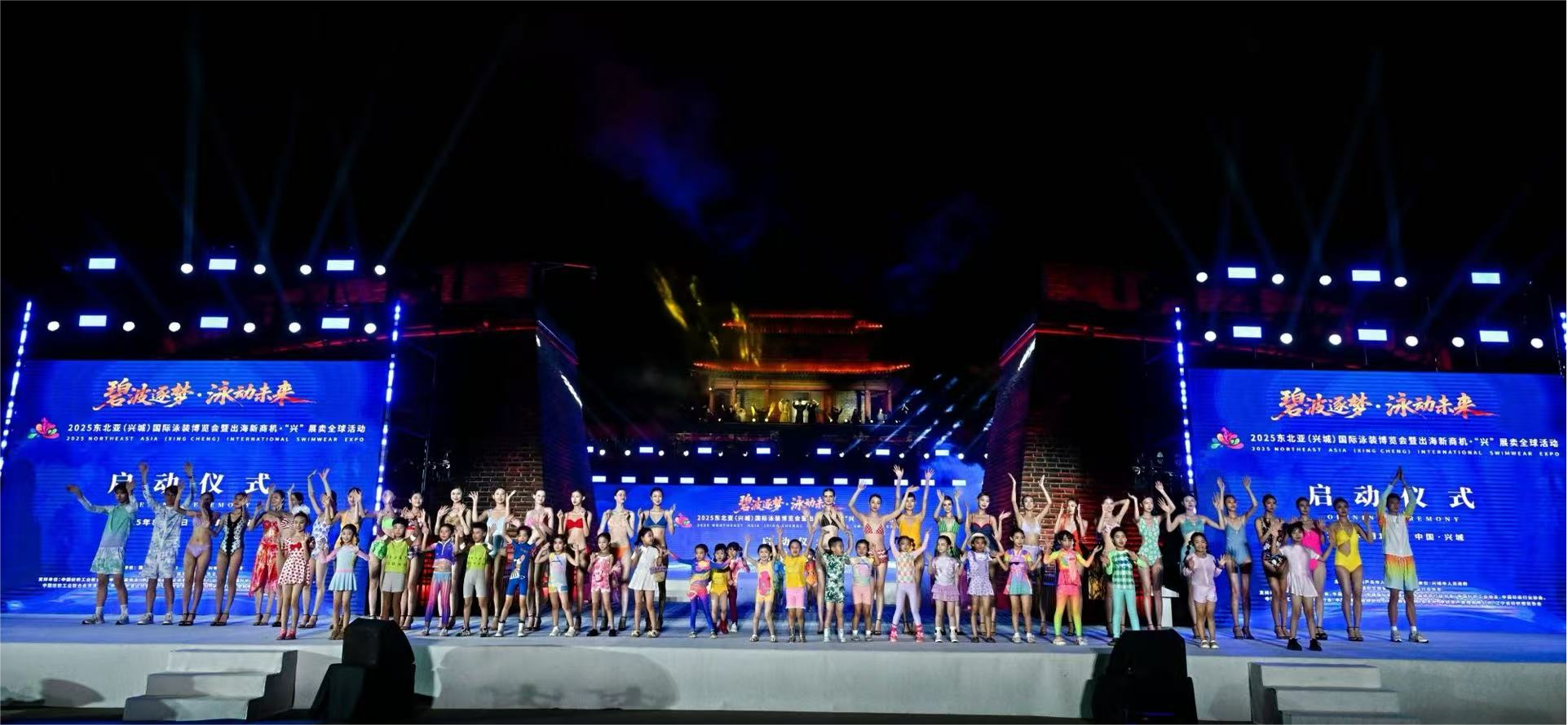 作为东北亚(兴城)国际泳装博览会的主活动,在“出海新商机・‘兴’展卖全球”启动仪式上,模特们身着融入国风刺绣、古典图案等元素的时尚泳装,穿梭于古韵十足的兴城宁远古城墙下,生动诠释了兴城“古城+泳装”的独特魅力。
