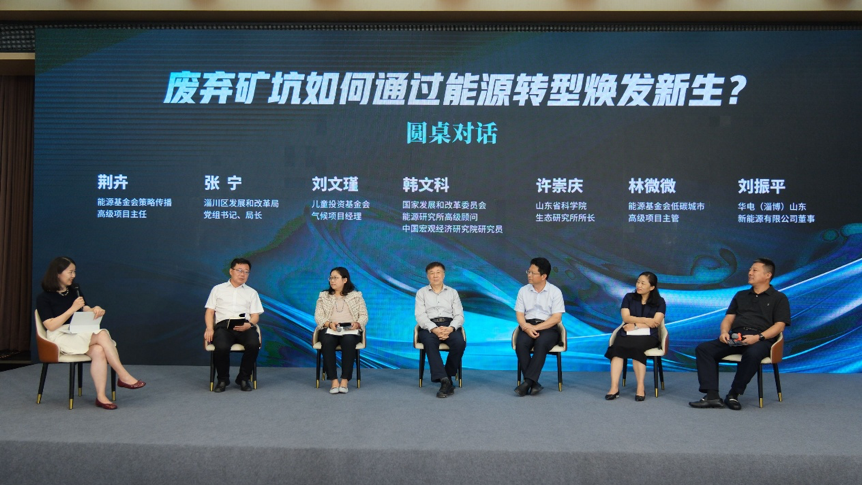 在圆桌对话环节,国家发展和改革委员会能源研究所高级顾问、中国宏观经济研究院研究员韩文科,山东省淄博市淄川区发展和改革局党组书记、局长张宁,儿童投资基金会气候项目经理刘文瑾,能源基金会低碳城市高级项目主管林微微,山东省科学院生态研究所所长许崇庆,山东减碳新能源有限公司负责人刘振平以“废弃矿坑如何通过能源转型焕发新生”为主题,围绕政策与规划引领、项目建设与技术创新、投资与金融模式创新、社会效益与乡村振兴、经验推广与复制、国际合作与传播展开对话。