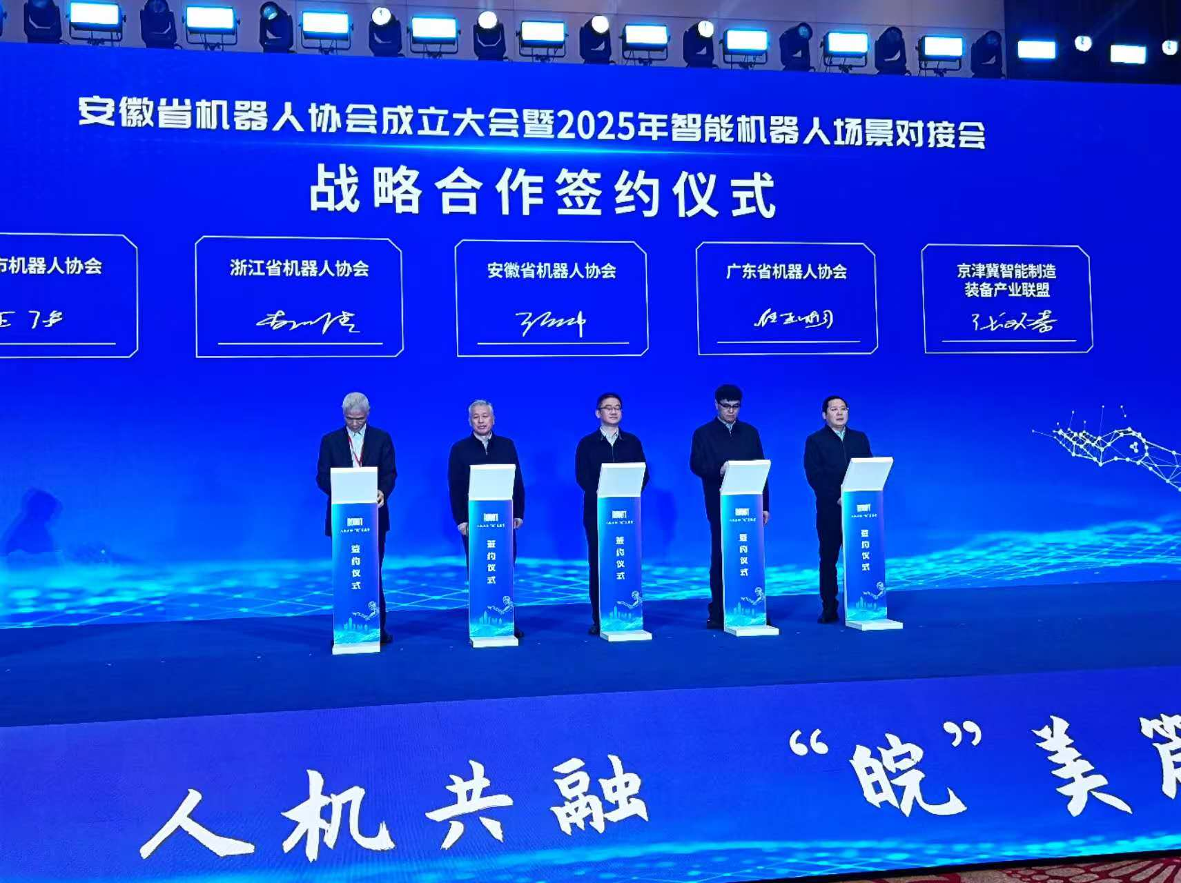 芜湖市政协主席张东、安徽省民政厅副厅长周文芳为协会专家咨询委员会主任委员、副主任委员及委员颁发证书。安徽省机器人协会会长游玮与上海市机器人协会会长王强、浙江省机器人协会会长李碧清、广东省机器人协会会长任玉桐、京津冀智能制造装备产业联盟秘书长张欢喜,签署战略合作协议,共同推动在技术创新、场景应用、资源共享等领域的协作,共同组织技术研讨会和产业对接活动、推动标准制定与知识产权保护、加强人才培养与交流,实现区域智能机器人产业的协同创新与高质量发展,共同打造智能机器人产业生态圈。