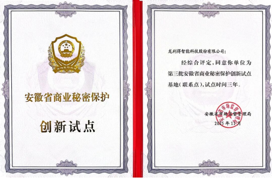 近日,安徽省商业秘密保护创新试点单位评选结果正式揭晓,龙利得凭借扎实的商业秘密保护基础、完善的管理体系及显著的创新实践,成功入选第三批安徽省商业秘密保护创新试点单位。此次入选,是安徽省市场监管局等部门对龙利得在商业秘密保护工作上的高度认可,也标志着公司在知识产权保护与创新发展领域迈上新台阶。
