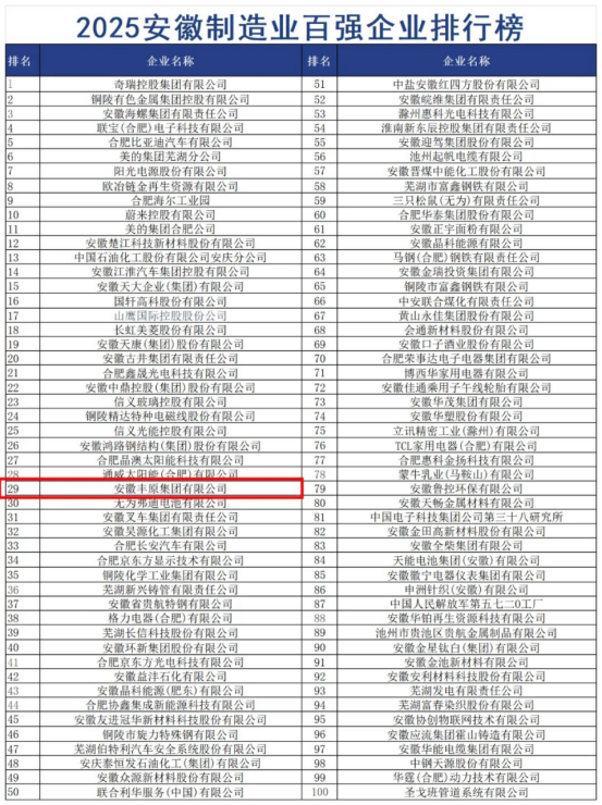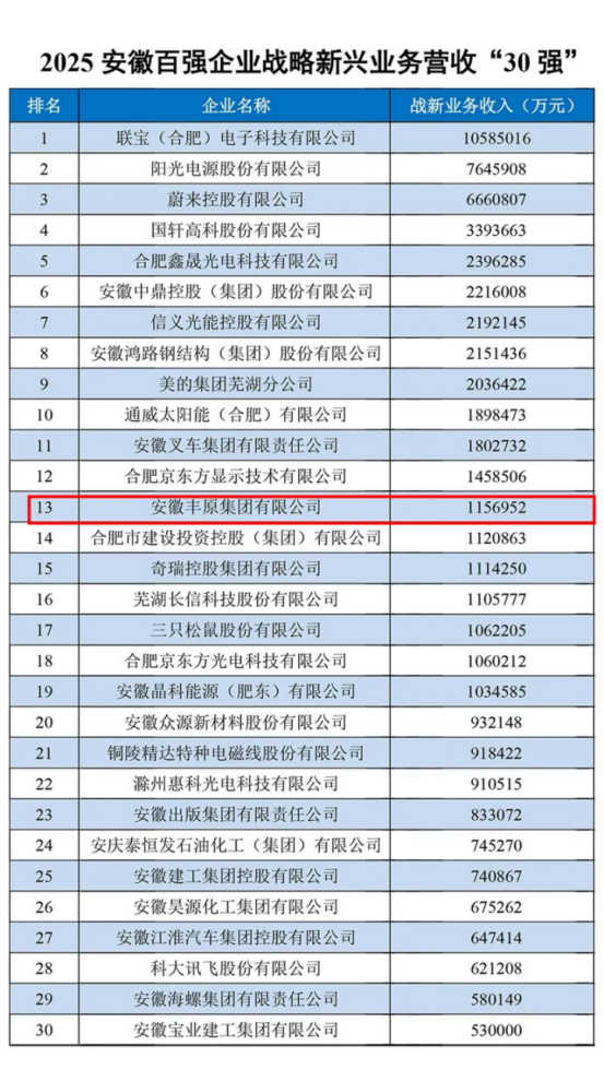 近日,2025安徽省百强企业发布会暨企业家论坛在合肥举行,会上发布了2025安徽百强企业、2025安徽制造业百强企业、2025安徽服务业百强企业、2025安徽百强企业战略新兴业务营收“30强”排行榜。丰原集团荣登“2025安徽百强企业”、“2025安徽制造业百强企业”和“2025安徽百强企业战略新兴业务营收“30强”榜单!