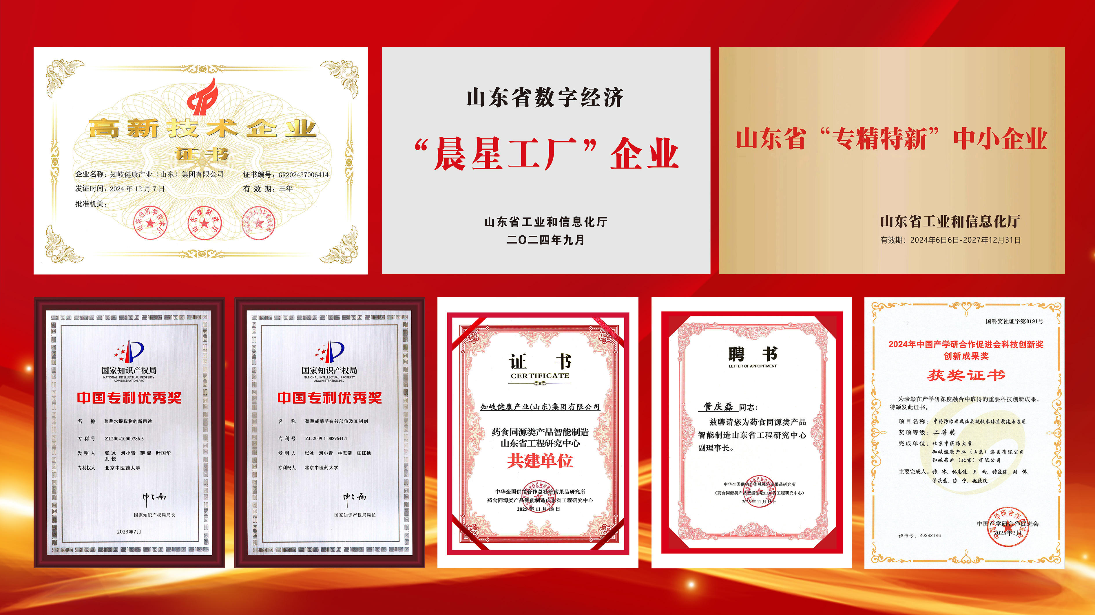 这是继知岐健康集团荣获国家高新技术企业、山东省“专精特新”企业、山东省数字经济“晨星工厂”企业、药食两用产品智能制造山东省工程研究中心、山东省中小企业创新研发中心、中国老年学和老年医学学会“产学研用创新平台”共建单位、“山东制造·鲁链优品”企业、中国好技术、中国食品企业履行社会责任优秀案例企业等权威认证之后,知岐健康集团斩获的又一项国家级荣誉!