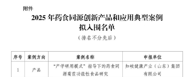 近日,中国中医药科技发展中心(国家中医药管理局人才交流中心)“2025年药食同源创新产品和应用典型案例”名单正式公示,知岐健康集团申报的《“产学研用模式”指导下的药食同源菊苣功能性食品研究》案例成功入选全国药食同源创新产品和应用典型案例,并荣登榜单前列。