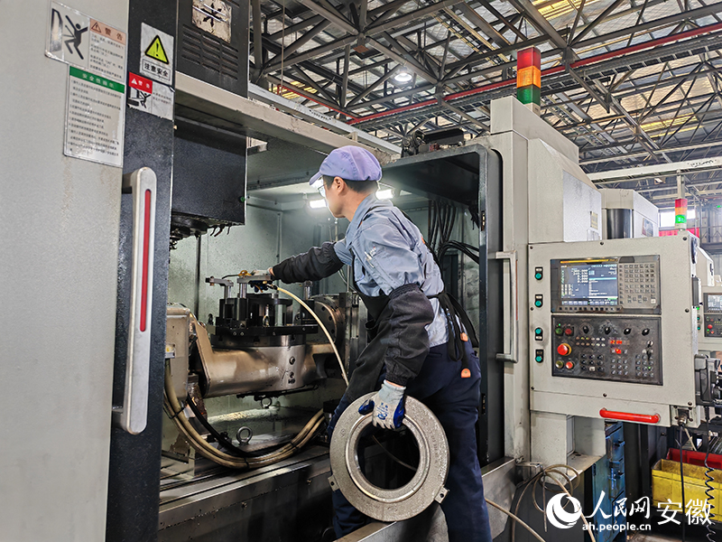 安徽海立精密厂房内,工人进行压盘机加工钻孔操作。