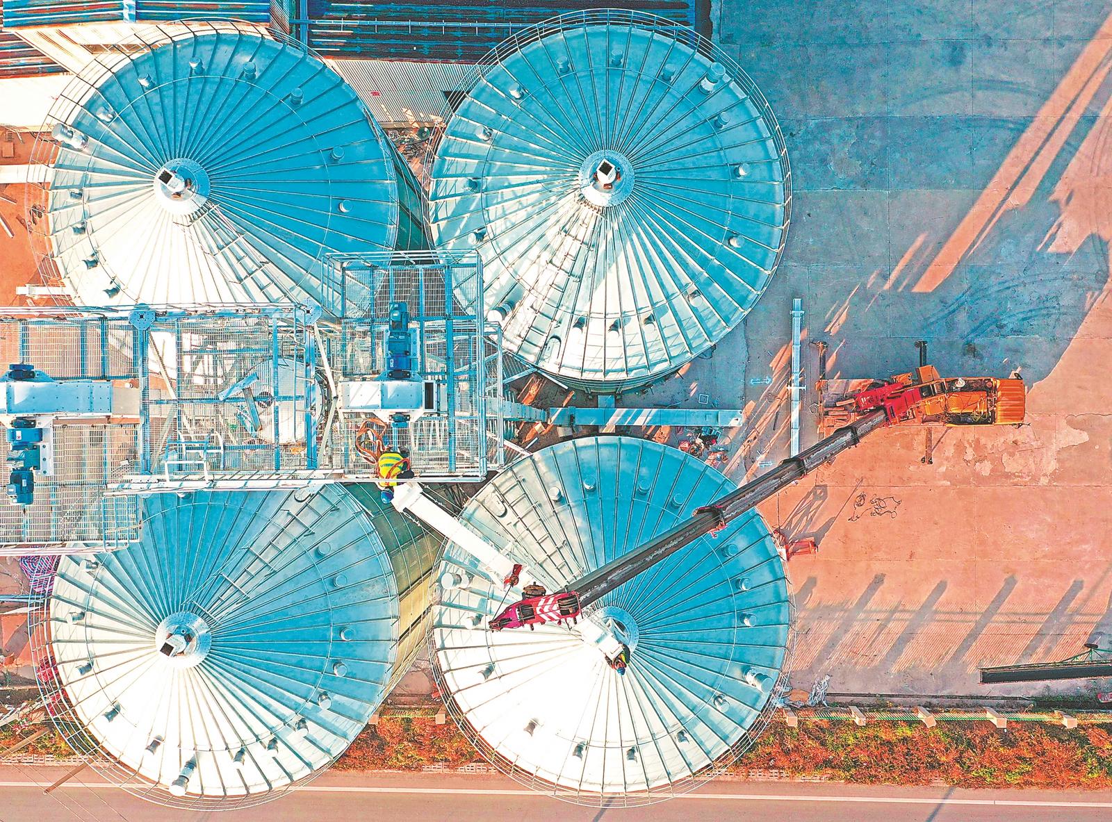 12月2日,位于宿松县的安徽农垦华阳河农场农服烘干中心,施工人员在给金属粮仓安装输粮管和加固粮仓。