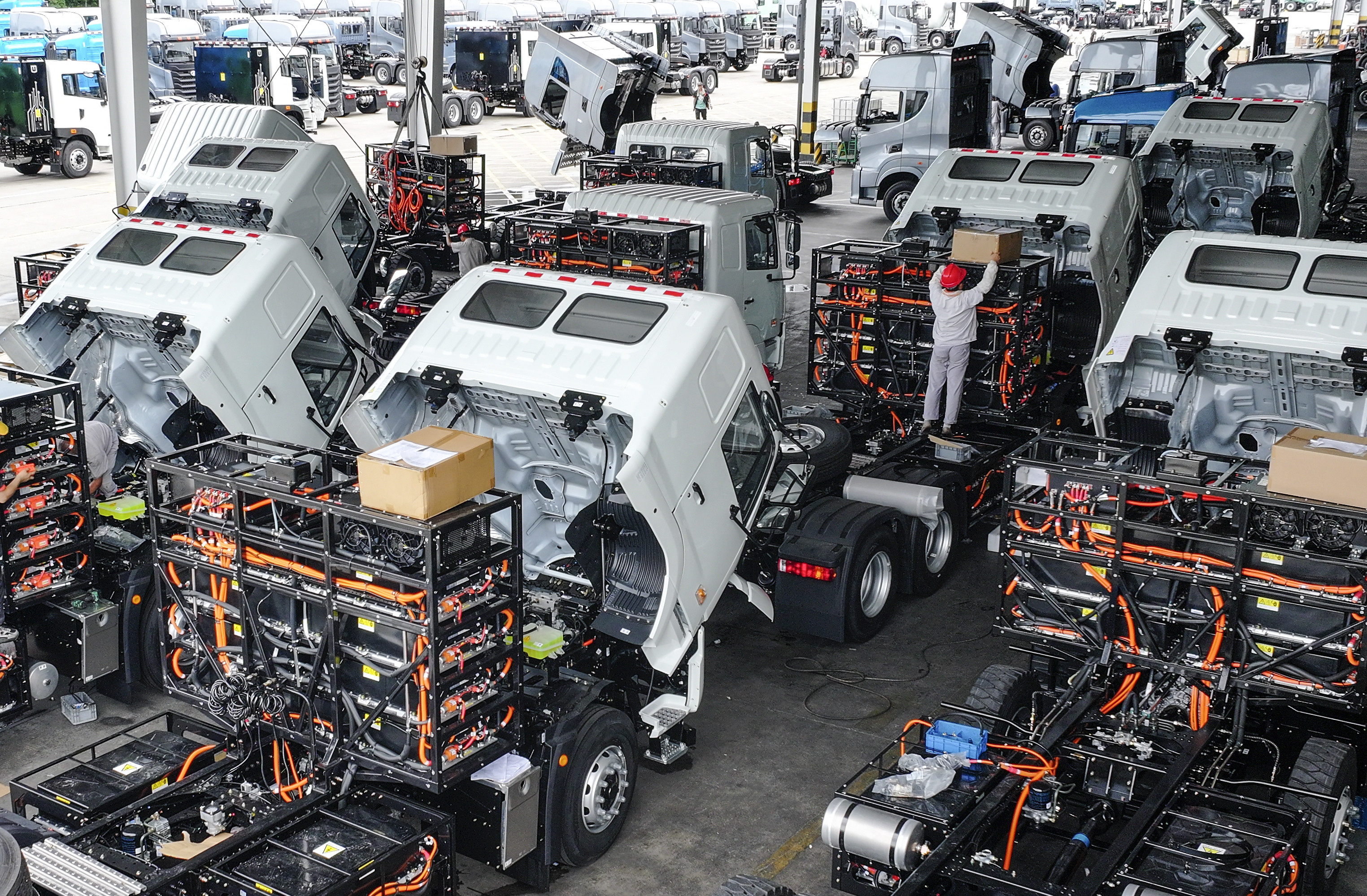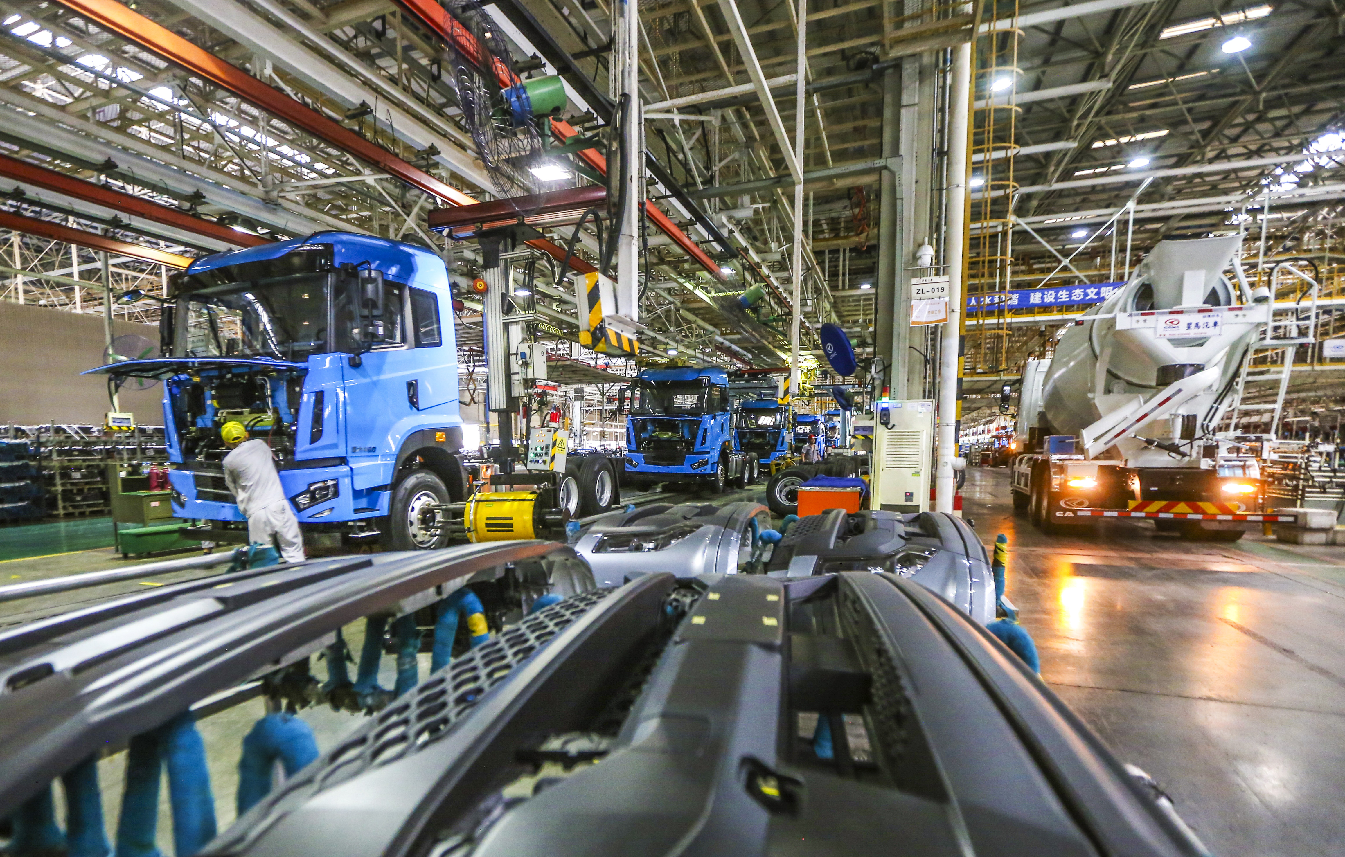 11月13日,在安徽马鞍山经开区汉马科技公司,工人们正在加紧赶制海内外新能源重卡汽车订单。该企业是国内最早进入新能源重卡领域的企业之一,今年以来,新能源重卡汽车研发生产销售全面提速,呈现内外贸产销两旺发展态势。1—10月重卡销售同比增长21.6%,其中电动中重卡同比增长47.49%,醇氢动力系统同比增长50.92%。产品除销售国内长三角城市外,还出口到印尼、沙特和拉美等国。