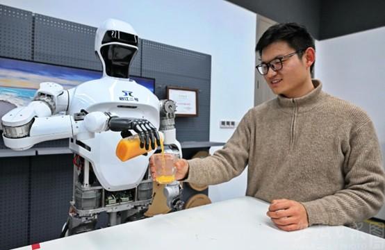 “启江二号”人形机器人手倒橙汁。