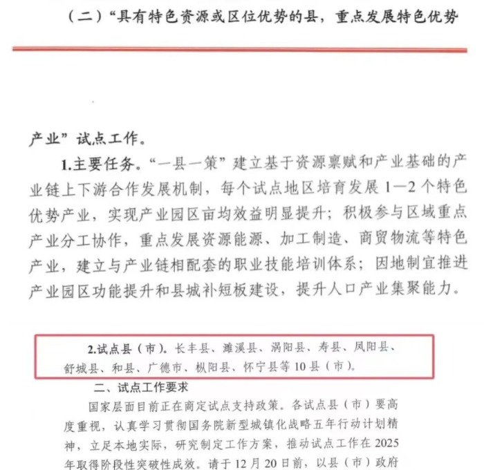 12月4日,涡阳县、长丰县、濉溪县、寿县、凤阳县、舒城县、和县、广德市、枞阳县、怀宁县等10县(市)被国家发展改革委列为安徽省“特色优势产业”试点县(市)