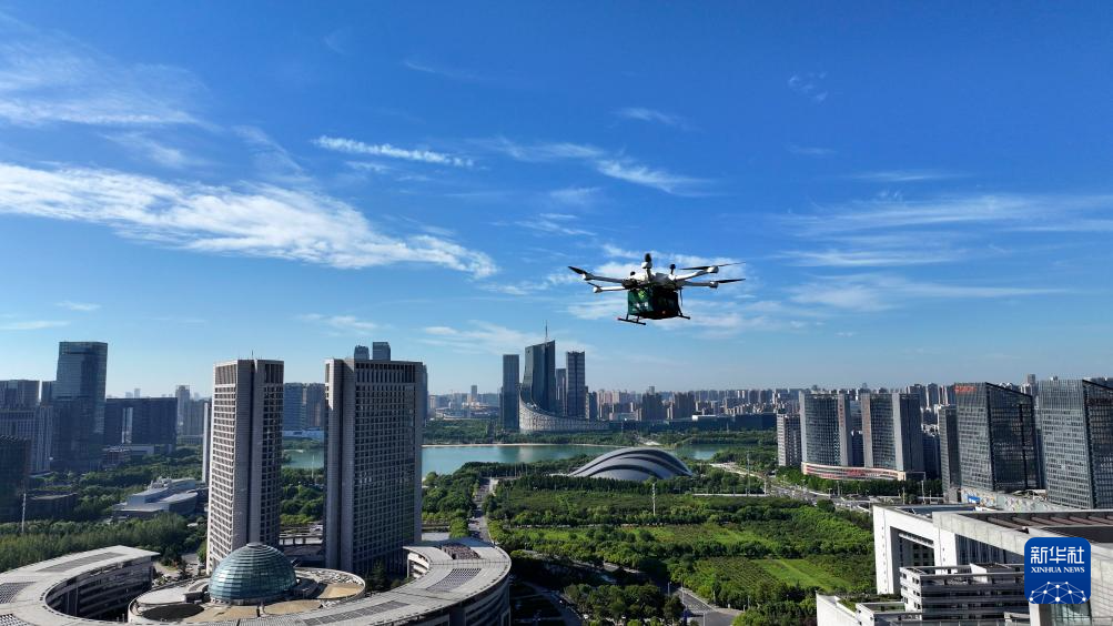 近日,在安徽省合肥市蜀山区上空,无人机在配送快递包裹(无人机照片)