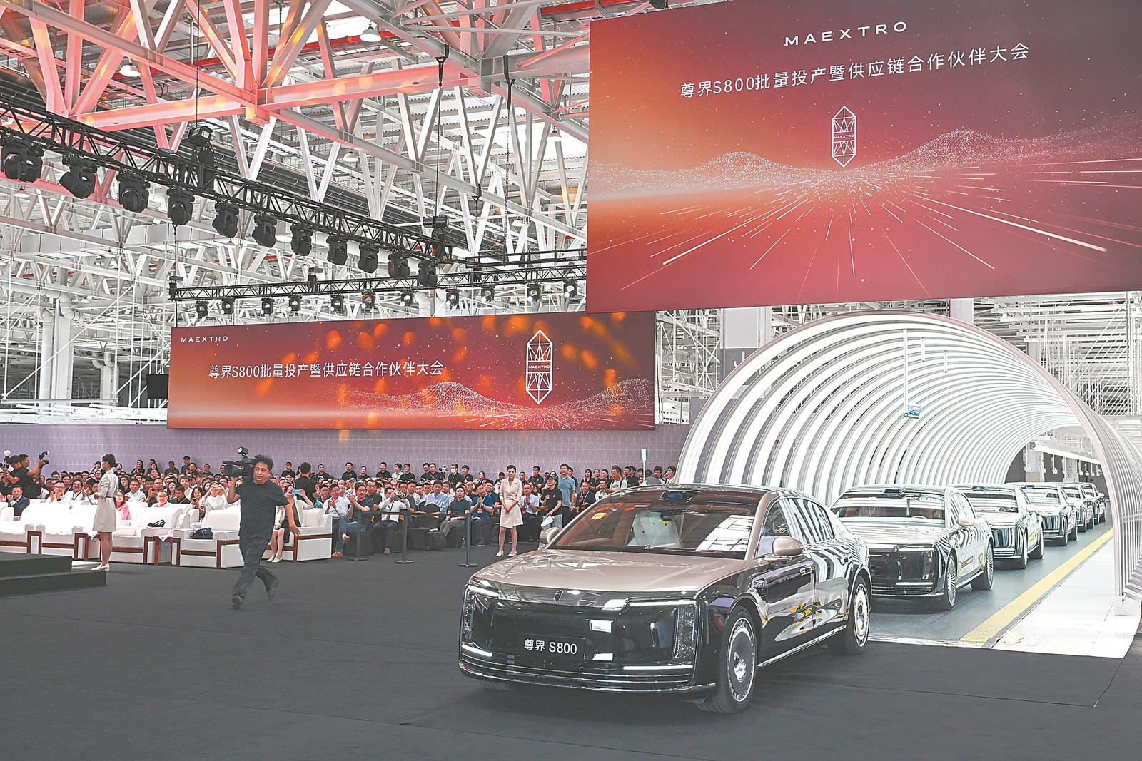 6月18日,尊界S800批量投产暨供应链合作伙伴大会在合肥举行。位于肥西县的尊界超级工厂内,一辆辆崭新的尊界S800鱼贯驶出,这款由江淮汽车与华为共同打造的豪华行政轿车开启批量投产,并将于下周启动限量599台的先行者交付计划。