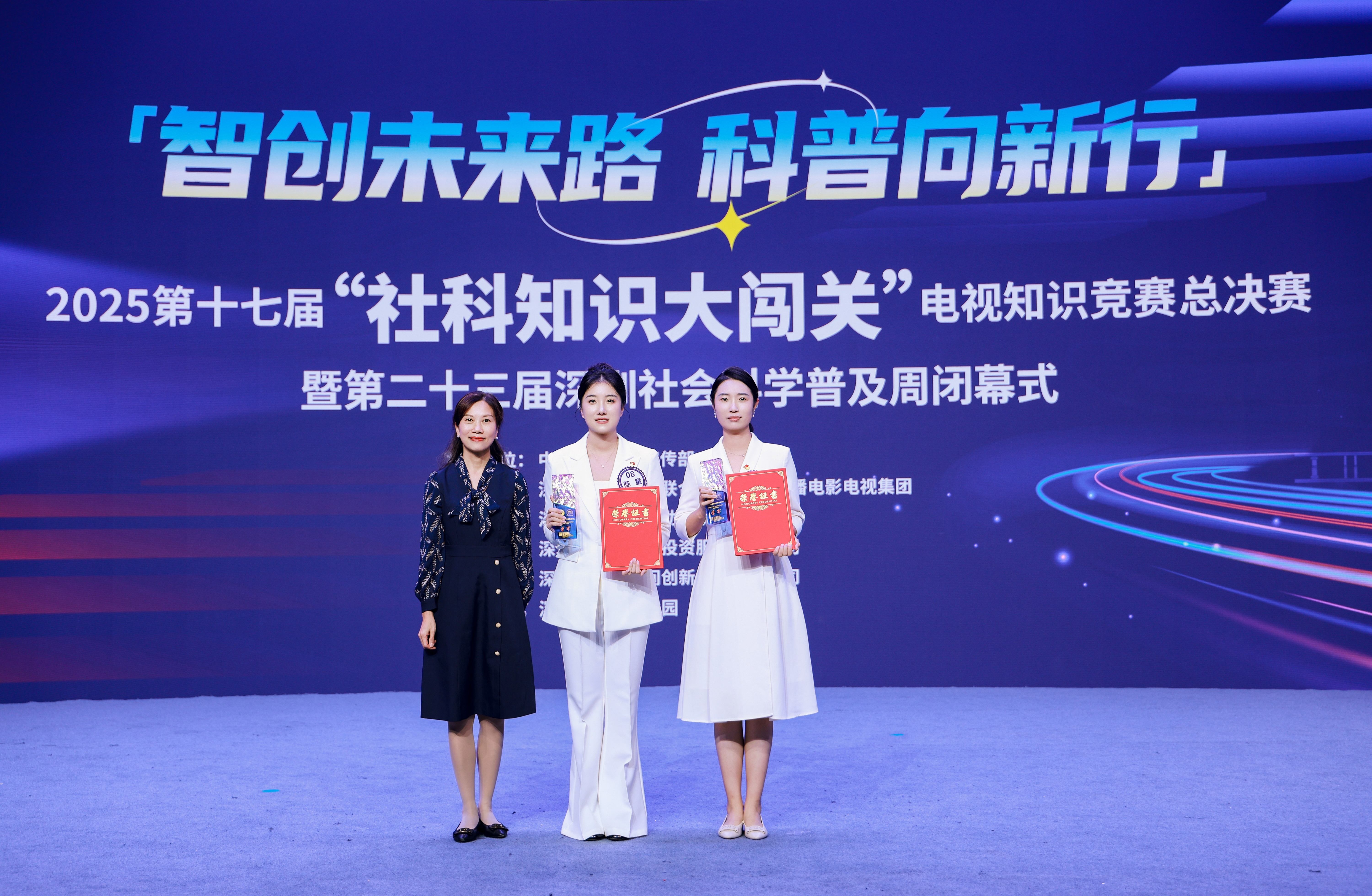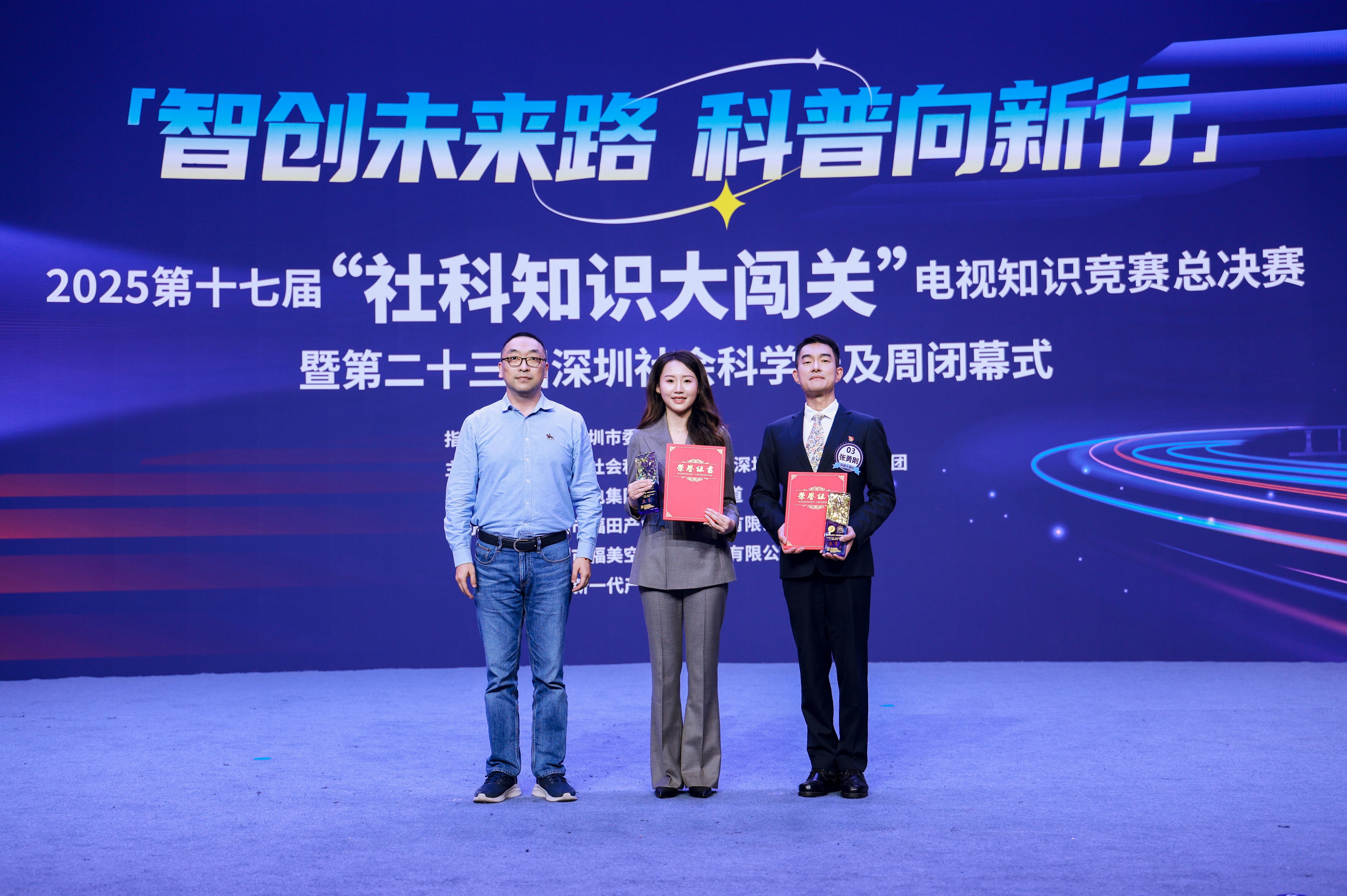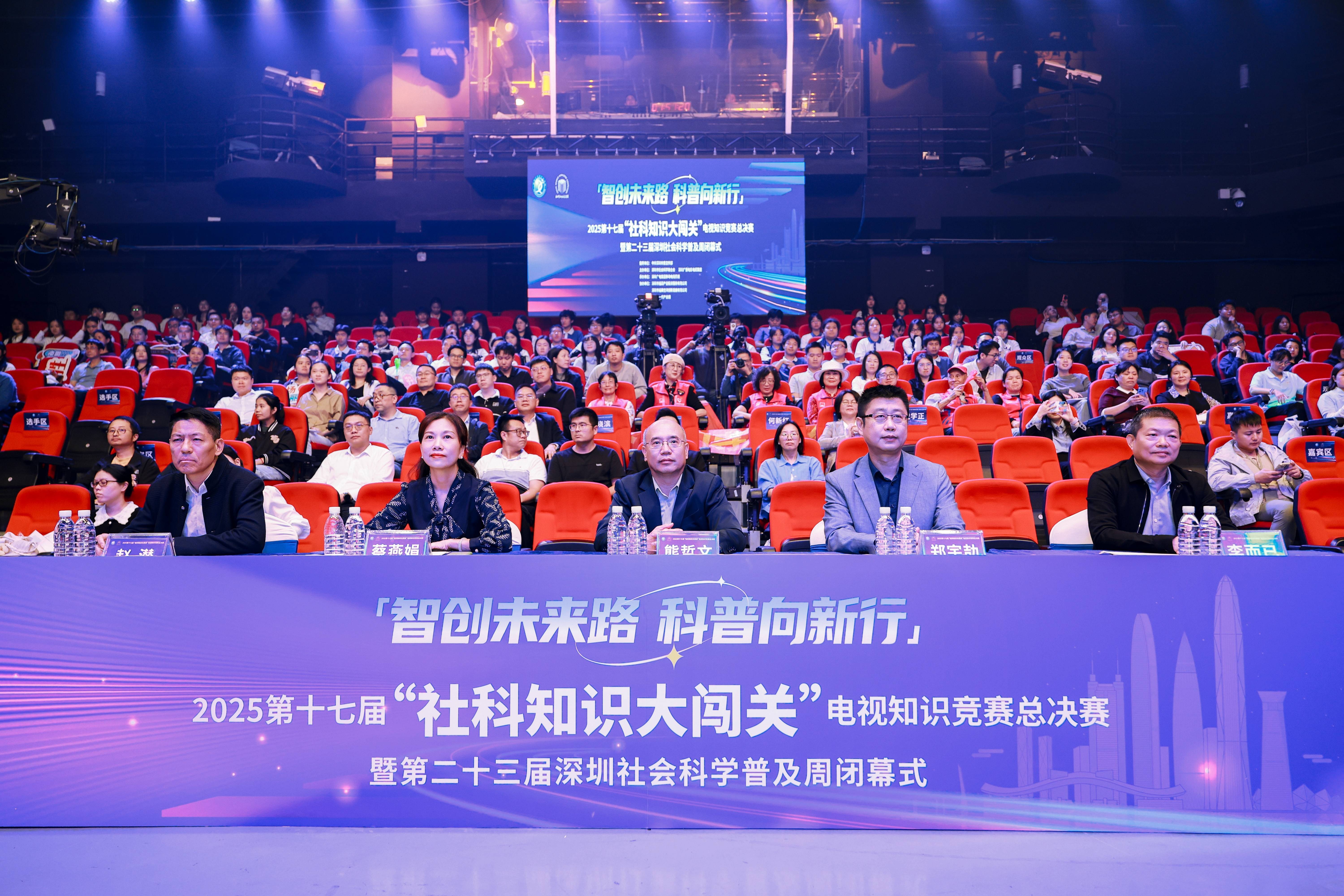 第十七届“社科知识大闯关”电视总决赛压轴登场,把本届科普周推向高潮。赛事9月启动,社会各界广泛关注、踊跃报名,比赛通过网络直播,吸引受众达上百万人次。经过初赛和半决赛的层层选拔,来自深圳市各行业各领域的10支队伍最终脱颖而出,成功晋级总决赛。决赛设置了“奋勇争先”“一触即发”“心有灵犀”“机智过人”“巅峰对决”等环节,题目聚焦新时代科技创新思想与战略、深圳科技创新发展与成就、智慧城市与数字深圳建设等内容。选手们沉着应对、精彩竞答,展现出了扎实的知识储备、出色的应变能力、深厚的社科素养与良好的精神风貌,赢得了现场阵阵掌声。经过近两个小时的激烈角逐,最终由来自深圳市鲲鹏股权投资管理有限公司的“鲲鹏智创队”摘得桂冠,深圳博物馆志愿服务队的“深南大道队”获得亚军,文理实验学校(集团)科创学校的“语润新知队”获得季军。