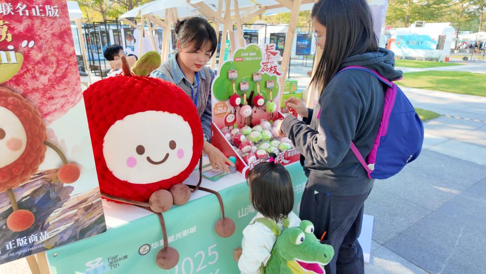 市集现场,电影放映设备展示区、即拍即“影”体验区、VR互动区和电影文创市集各具特色。其中VR互动体验区始终排着长队,体验者戴上设备,一秒切换身份,或踏上世界之巅,或漫步史前侏罗纪,感受第一视角带来的震撼。电影文创市集则汇聚了“奶龙”“浪浪山小妖怪”“小喜荔”等热门IP衍生品,成为最受年轻观众欢迎的区域之一。“这些文创设计既有创意又充满温度,让我忍不住想把喜欢的角色都带回家。”正在挑选周边的市民林女士表示。