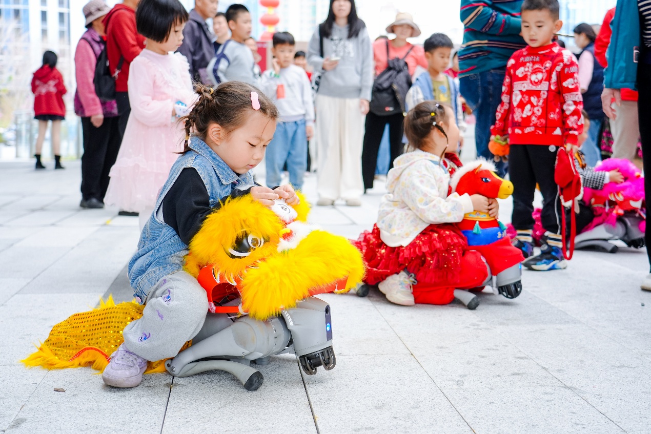 新春伊始,灵巧的机器狗身披盛装,摇身一变成为年味儿十足的生肖瑞兽。红色骏马与多彩舞狮并列而立,和着音乐节奏,整齐迈动四肢、摆动躯干,为围观市民读者献上动感十足的编队舞蹈与舞狮表演。