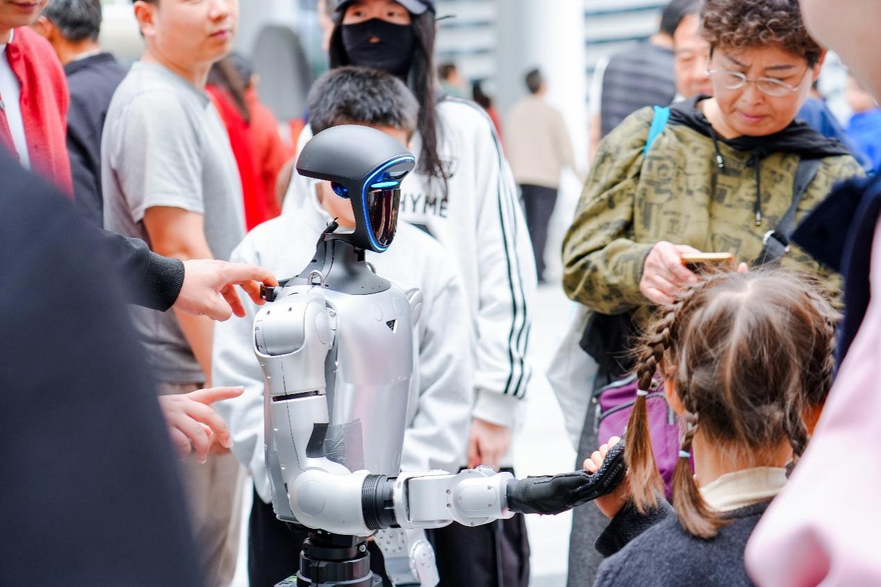 表演期间,机器人化身兢兢业业的专业演员;演出结束后,又成为平易近人的友好伙伴。机器马与机器舞狮成为孩子们喜爱的“座驾”,化身带来欢乐的趣味玩伴;人形机器人与市民读者近距离互动,招手、握手、击掌、对视……宛如电影场景照进现实,生动诠释“未来已来”。市民读者还在工作人员指导下亲手操控机器人,亲身感受智能科技与人机交互的独特乐趣。