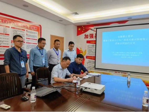广西工业振兴特派员工作队驻贵港市工作队(以下简称“驻贵港市工作队”)积极发挥政策“宣传员”作用,搭建好政银企之间的沟通桥梁。近日,由驻贵港市工作队主办的金融惠企宣讲暨建行贵港分行与广西凯伦新材料有限公司贷款合同签约仪式在中国建设银行贵港分行顺利举行,新落户贵港市覃塘区的广西凯伦新材料有限公司获中国建设银行发放的贷款总额1.7亿元。