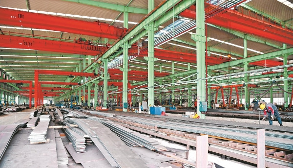 近日,工人在广西钢之泰装配式绿色建筑产业有限公司钢构产品生产车间作业。