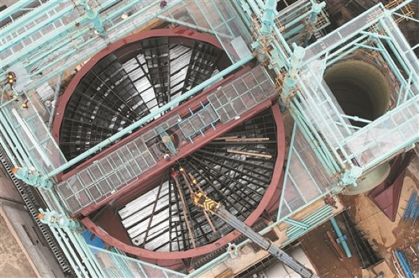 6月13日,在柳钢集团烧结厂1#360㎡烧结烟气SCR脱硝及烟气深度净化升级改造现场,工人正在加紧施工,全力推进项目建设。