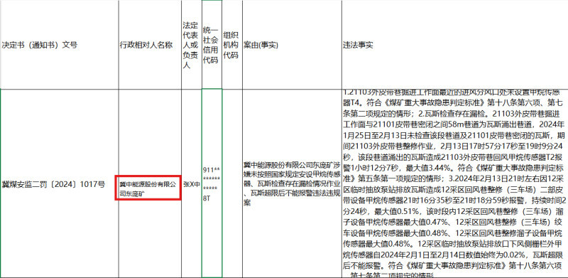 近日,国家矿山安全监察局河北局发布的行政处罚公示信息,冀煤安监二罚﹝2024﹞1017号决定书(通知书)显示,冀中能源股份有限公司东庞矿,涉嫌未按照国家规定安设甲烷传感器、瓦斯检查存在漏检情况作业、瓦斯超限后不能报警违法违规案,该矿及负责人被累计罚款383万元。