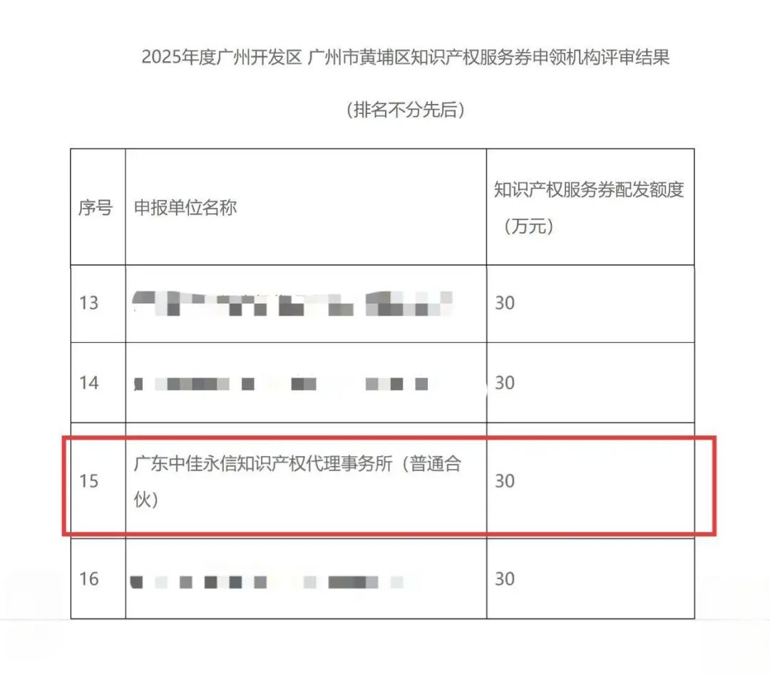 8月25日,广州开发区知识产权局公示2025年度知识产权服务券申领机构评审结果,中佳集团成功通过评审,入选2025年度广州开发区、黄埔区知识产权服务券申领机构。这项由政府财政支持的政策创新,通过"政府补贴+机构让利"的创新模式,有效降低企业知识产权运营成本。