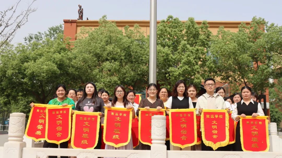 榜样引领文明花开。仪式现场对24个文明班级、15个文明宿舍及8组文明餐桌进行表彰。当获奖班级班主任从校领导手中接过流动红旗时,操场响起经久不息的掌声。这份荣誉不仅是对文明行为的肯定,更是对“十不准十做到”行为准则的生动诠释。正如主持人所言:“每个弯腰捡纸屑的瞬间,每句礼貌问好的话语,都是对五四精神最鲜活的传承。”