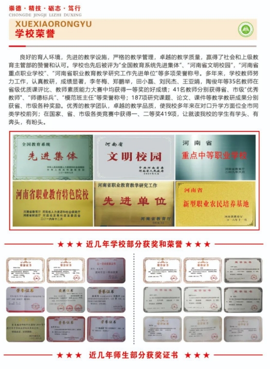 近年来,学校对口高招考入河南科技大学、河南师范大学、信阳师范大学、河南科技学院等本科院校的学生502人,考入河南职业技术学院、河南工业职业技术学院等大专类院校的学生5600多人。在省、市每年举办的职业技能大赛、素质能力和传统文化等赛项中获得一、二等奖496项。