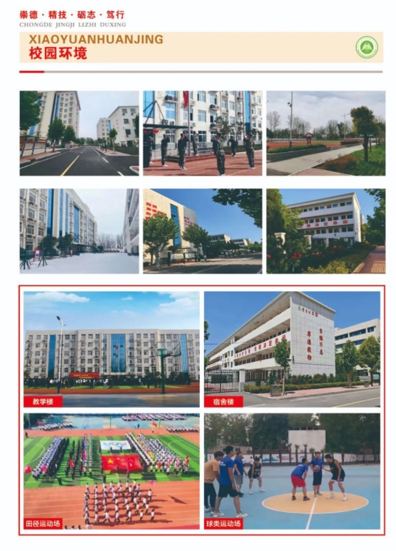 校园布局合理,环境宜人。教学楼、实训楼、学生宿舍楼、实习实训场所及体育场、餐厅、图书馆、阅览室一应俱全。有供学生实习实训的网络布线实训室、云机房、多媒体实训室、汽车维修实训车间、幼儿保育实操室、舞蹈教室、钢琴教室、合唱教室、中西餐摆台、茶艺实训室,艺术插花实训室、嫁接实训室、宠物美容实训室、工艺美术画室、运动器材室、心理咨询中心等实训中心30余个,实习实训设备能完全满足各专业教学需要,且在全市职业学校中居于领先行列。