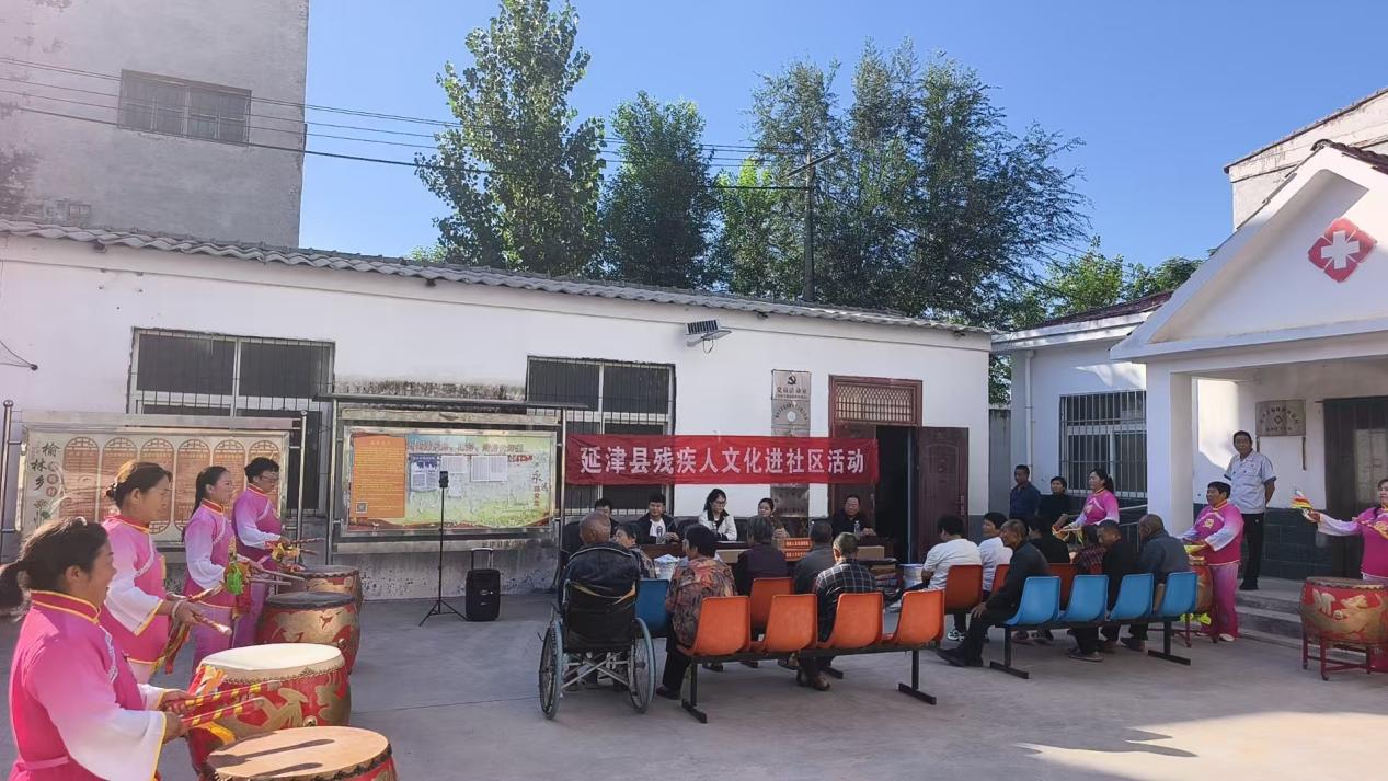 2025年9月24日,在河南省延津县榆林乡夹堤村党群服务中心大院,欢庆的盘鼓阵阵敲响,残疾人的脸上洋溢着暖心的笑容,县残联正在这里开展“残疾人文化进社区”活动,为夹堤村残疾人群体送去了文化服务与支持。