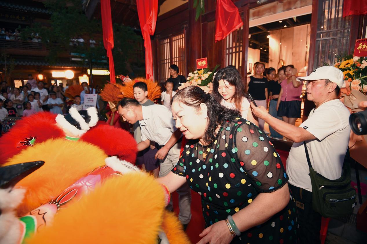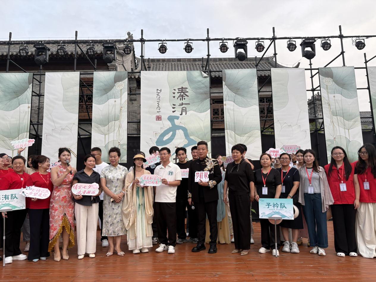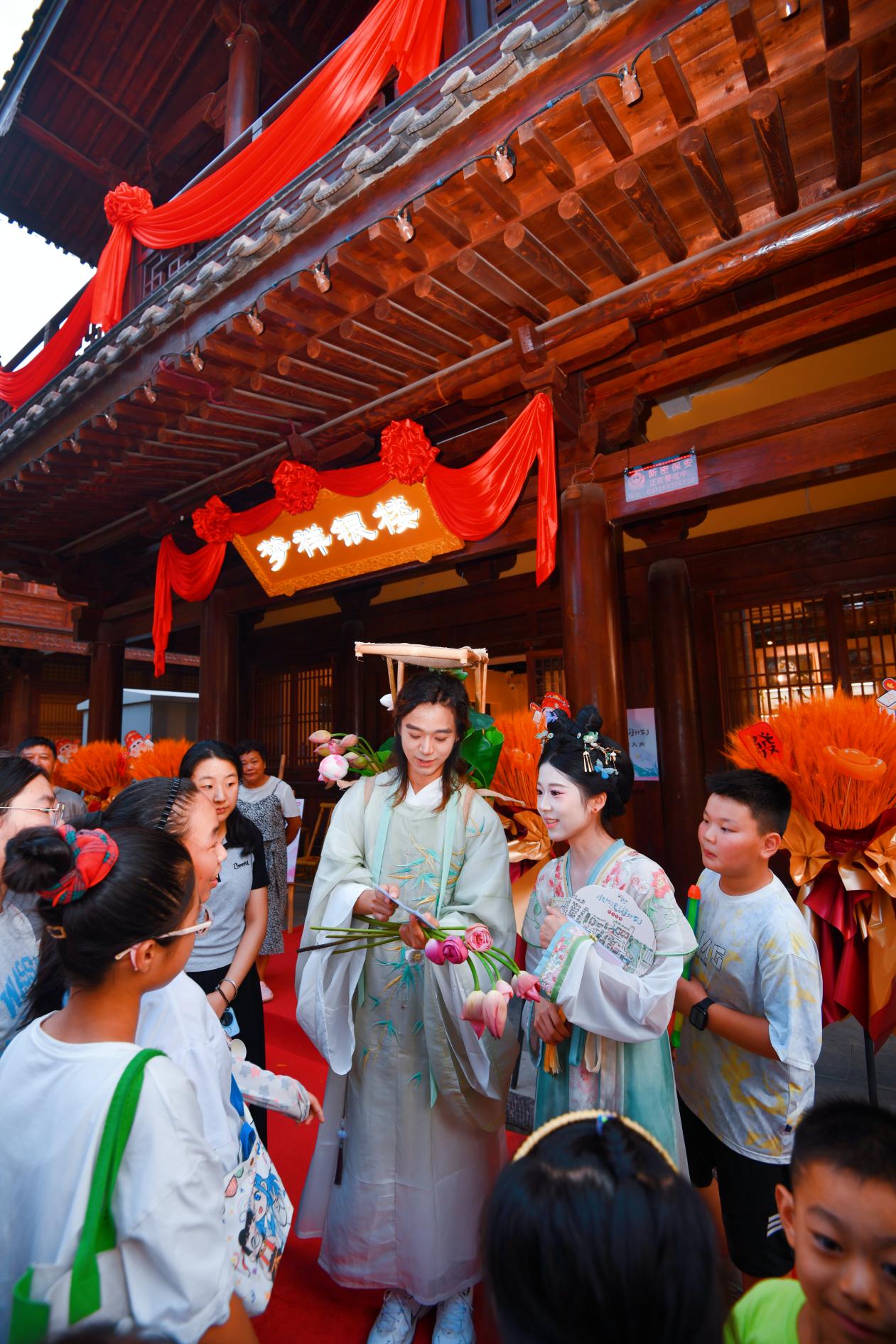 当日恰逢传统七夕佳节,梦祥银楼开业典礼与溱洧水城园区活动深度联动:园区同步开展的相亲大会为单身游客搭建浪漫交友平台,现场设置“银饰信物互赠”环节;身着素雅传统服饰的“荷花郎”沿水城街巷游园互动,向游客派送新鲜荷花与银楼打卡指引,引导大家参与银饰DIY、非遗錾刻体验等活动。多重特色活动相映成趣,不仅丰富了游客的七夕体验,更以“文化+互动”的形式,为现场营造出兼具传统韵味与节日欢乐的沉浸式氛围。