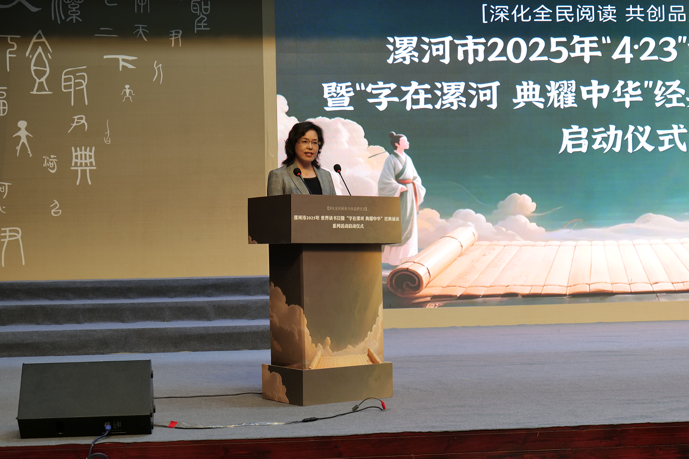 图注:漯河市教育局党组副书记、副局长高伟玲宣读全民阅读倡议书
