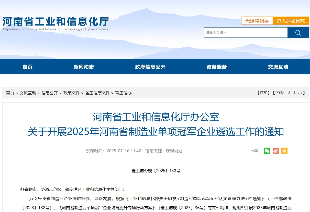 7月16日,河南省工业和信息化厅官网发布消息,2025年河南省制造业单项冠军企业遴选工作正式启动,重点支持新一代信息技术、装备制造、新材料、智能网联汽车及新能源汽车、新能源、节能环保、航空航天与海洋装备、生物医药等重点领域关键环节企业,详细内容如以下全文: