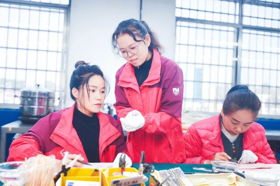 面对学习慢或操作失误的新人,她从不用急功近利的方式,而是“用自己的经历去引导,告诉他们我当年也犯过哪些错,又是怎么改进的”。她记得有个徒弟起初总是把握不好力度,她便陪着徒弟一遍遍练,“从简单的饰品开始,慢慢找手感,后来他不仅技术扎实了,还把‘耐心打磨’的理念刻进了心里,现在也成了车间的技术能手。这种传承的意义,比教会一门技术更珍贵”。