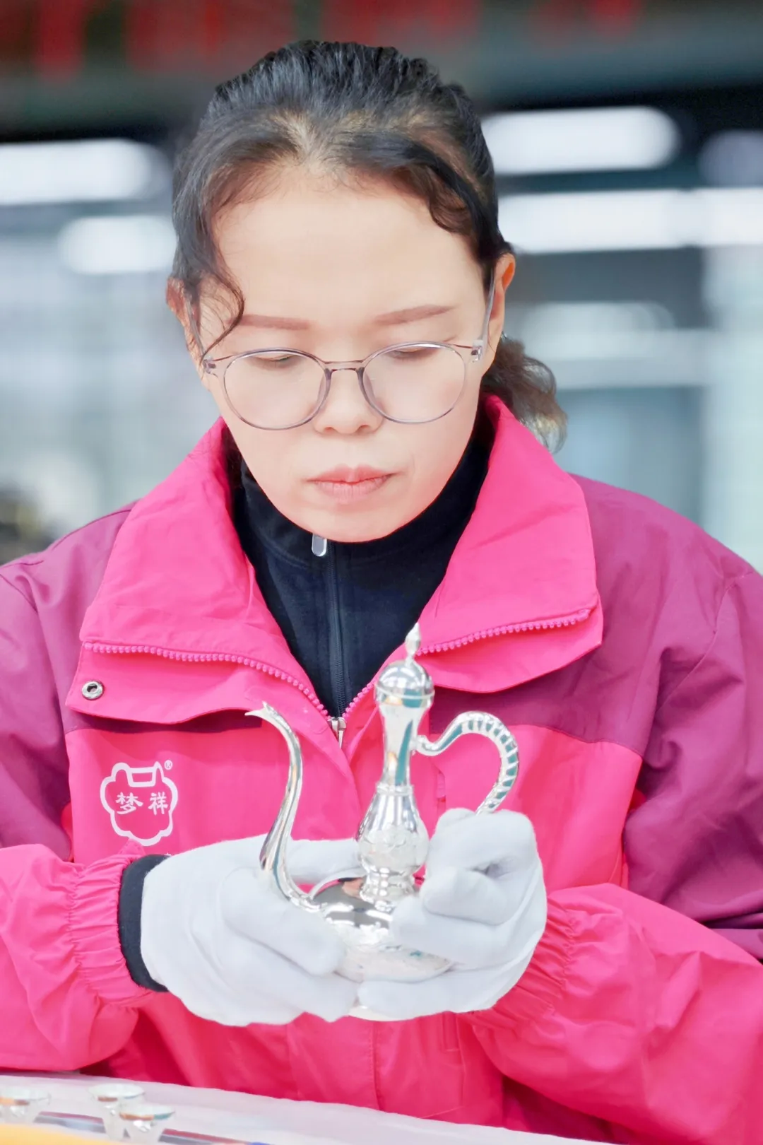 从2012年到2023年,十年抛磨,龙雅丽把自己活成了“梦祥匠心”的具象化——她的手心有抛光工具留下的薄茧,也有无数银饰经她手后焕发的璀璨光泽;她的身上有匠人的沉稳,更有传承技艺时的热忱温度。这便是梦祥的匠心,在一个个平凡岗位上,由一代代匠人用热爱与坚守,书写着不朽的传奇。