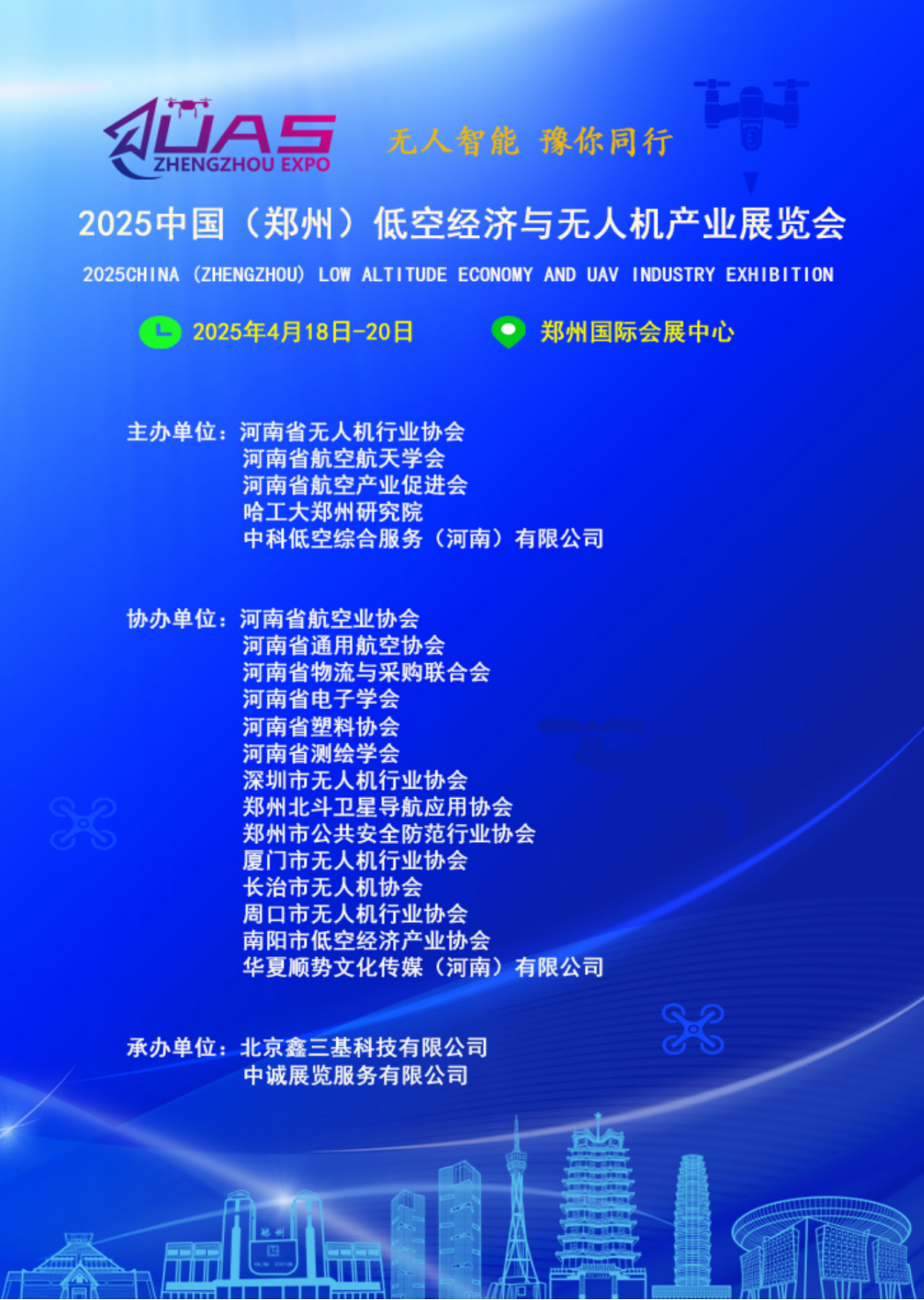本次展会由河南省无人机行业协会、河南省航空航天学会、河南省航空产业促进会、哈工大郑州研究院、中科低空综合服务(河南)有限公司主办,北京鑫三基科技有限公司、中诚展览服务有限公司承办。展会预计展出面积达20,000平方米,专业采购商人数约10,000人次。同期还拟举办“中国(郑州)无人机应用与创新交流会”等相关论坛活动。