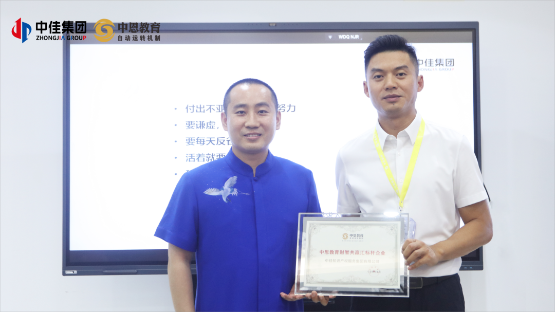 交流会现场,中恩教育董事长贺传智代表中恩教育集团向中佳集团授予“中恩教育财智共赢汇标杆企业”奖牌。该荣誉旨在表彰中佳集团在构建专业化服务体系、推动行业创新实践中取得的显著成效,彰显知识产权服务领域的标杆引领价值。