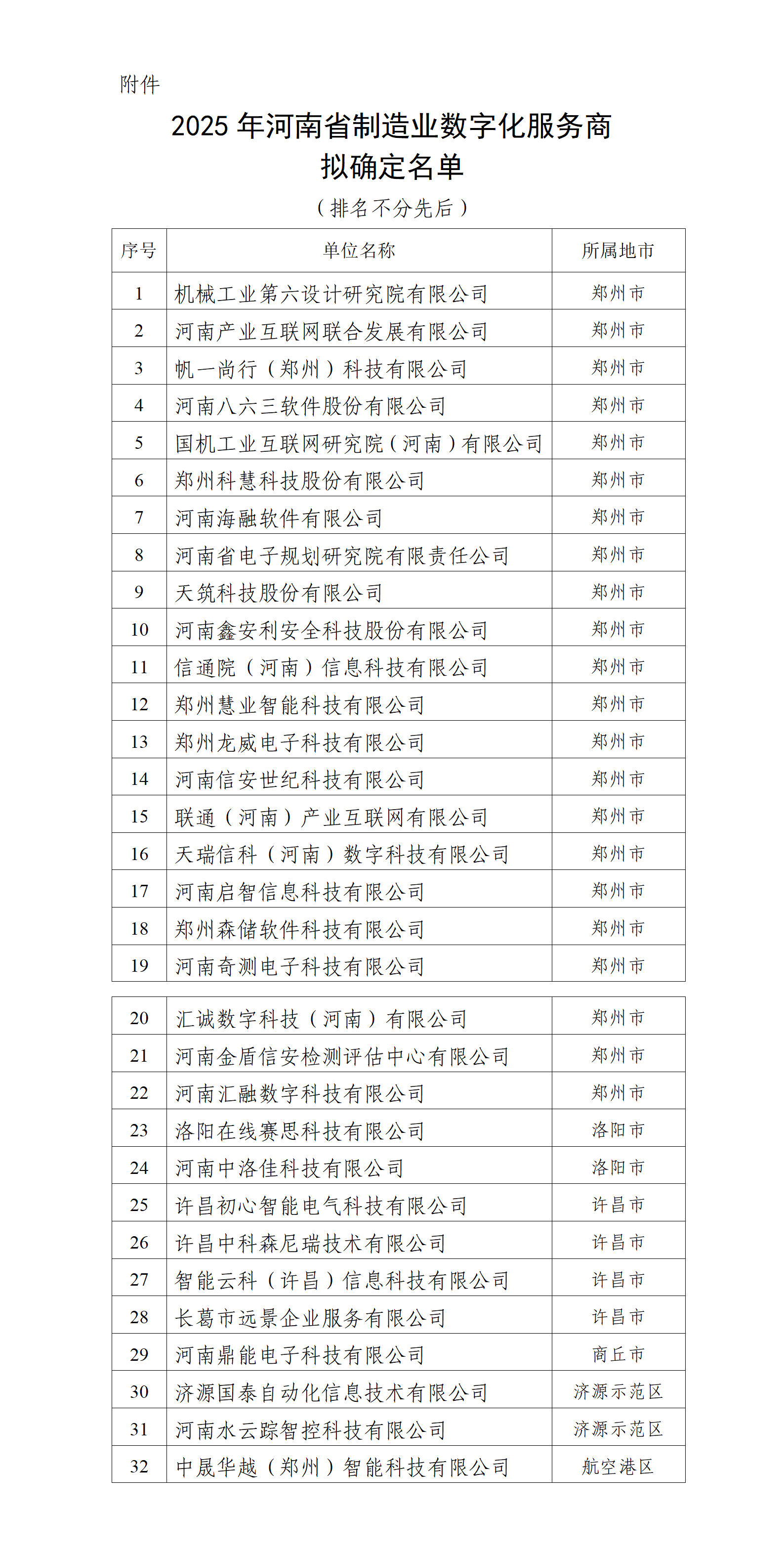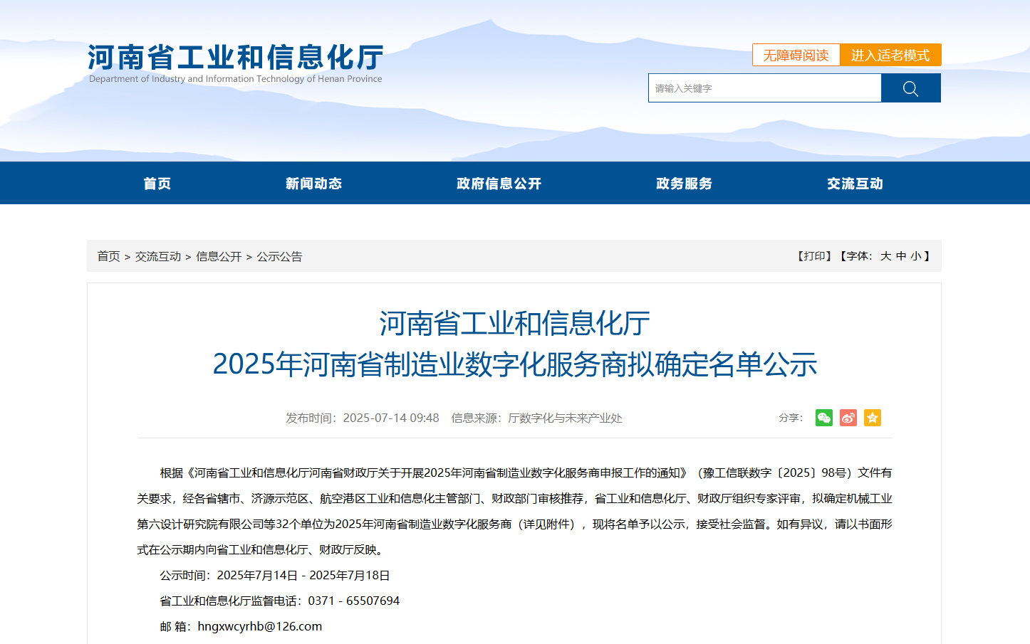 7月14日,据河南省工业和信息化厅公示消息,根据《河南省工业和信息化厅河南省财政厅关于开展2025年河南省制造业数字化服务商申报工作的通知》(豫工信联数字〔2025〕98号)文件有关要求,经各省辖市、济源示范区、航空港区工业和信息化主管部门、财政部门审核推荐,省工业和信息化厅、财政厅组织专家评审,拟确定机械工业第六设计研究院有限公司等32个单位为2025年河南省制造业数字化服务商,现将名单予以公示,接受社会监督。如有异议,请以书面形式在公示期内向省工业和信息化厅、财政厅反映。