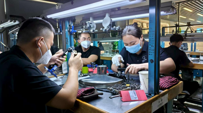 二楼展厅,除了展示大克拉培育钻石首饰之外,还设置了切磨加工区域,工人们正打磨各式各样的钻石样式。