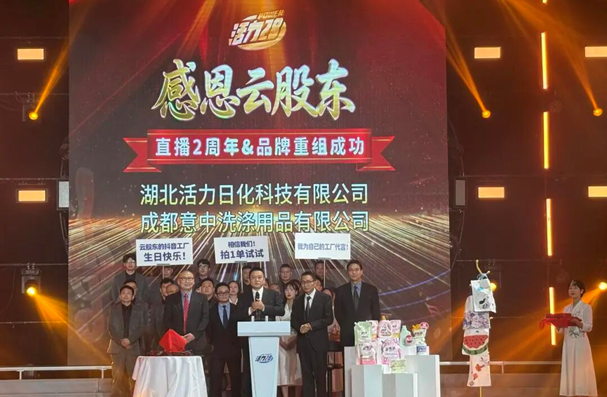 9月13日,在活力28衣物清洁旗舰店抖音直播间,当意中公司副总经理胡文忠与三位主播大叔及员工们共同切开庆典蛋糕时,这个瞬间被永远定格——活力28品牌重组成功的喜悦,与1370万“云股东”的期待在此刻交汇