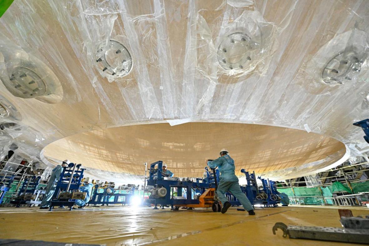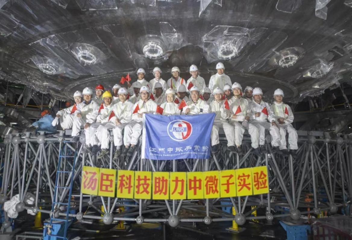 进入8月份,我国重大科研基础设施——广东江门中微子探测实验装置建设项目液闪灌装工作已接近尾声。据江门中微子实验发言人中国科学院院士王贻芳介绍,江门中微子有机玻璃探测器是一个有效质量2万吨的液体闪烁体探测器,在完成液闪灌装后将承受3000多吨的纯浮力作用,其最内层的有机玻璃球,由江苏汤臣集团旗下的汤臣(江苏)材料科技股份有限公司(以下简称“汤臣科技”)承建。
