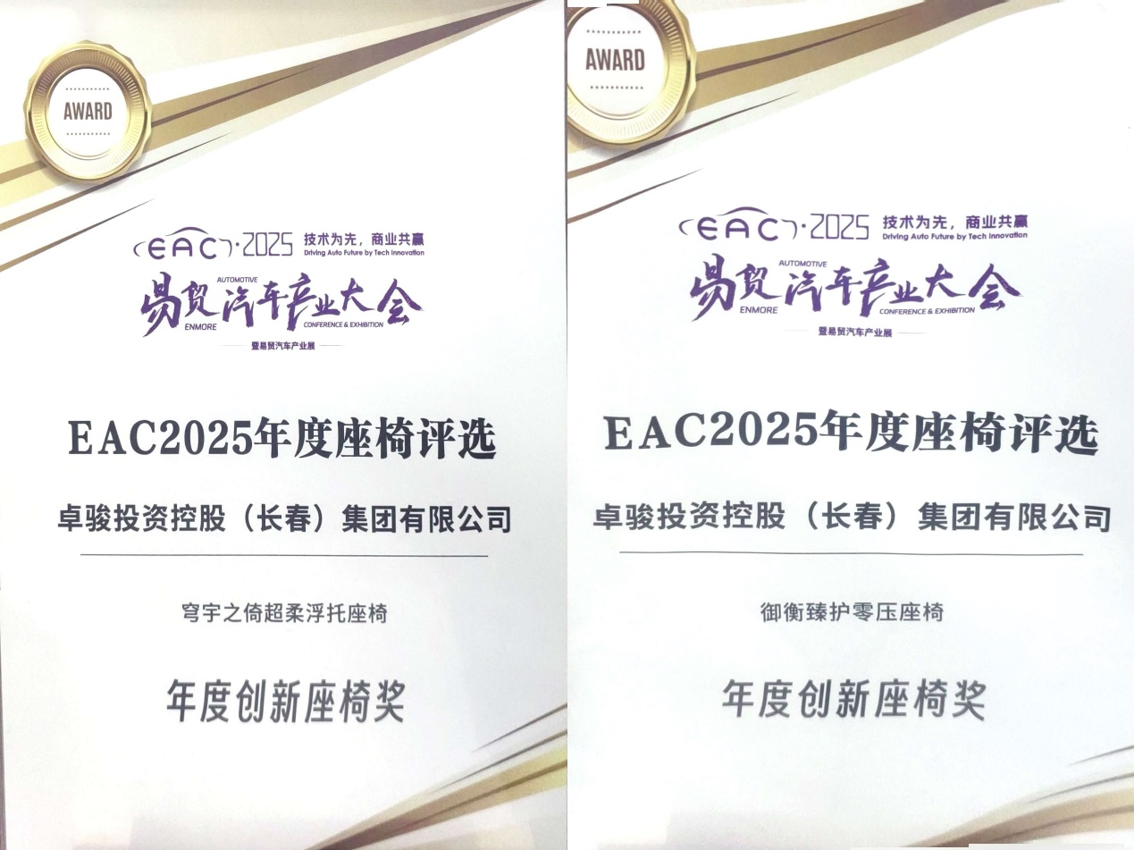 在EAC2025易贸汽车产业大会上,卓骏控股研发的创新座椅产品从众多竞争者中脱颖而出,其御衡臻护零压座椅以及穹宇之椅超柔浮拖座椅荣获“年度创新座椅奖”。