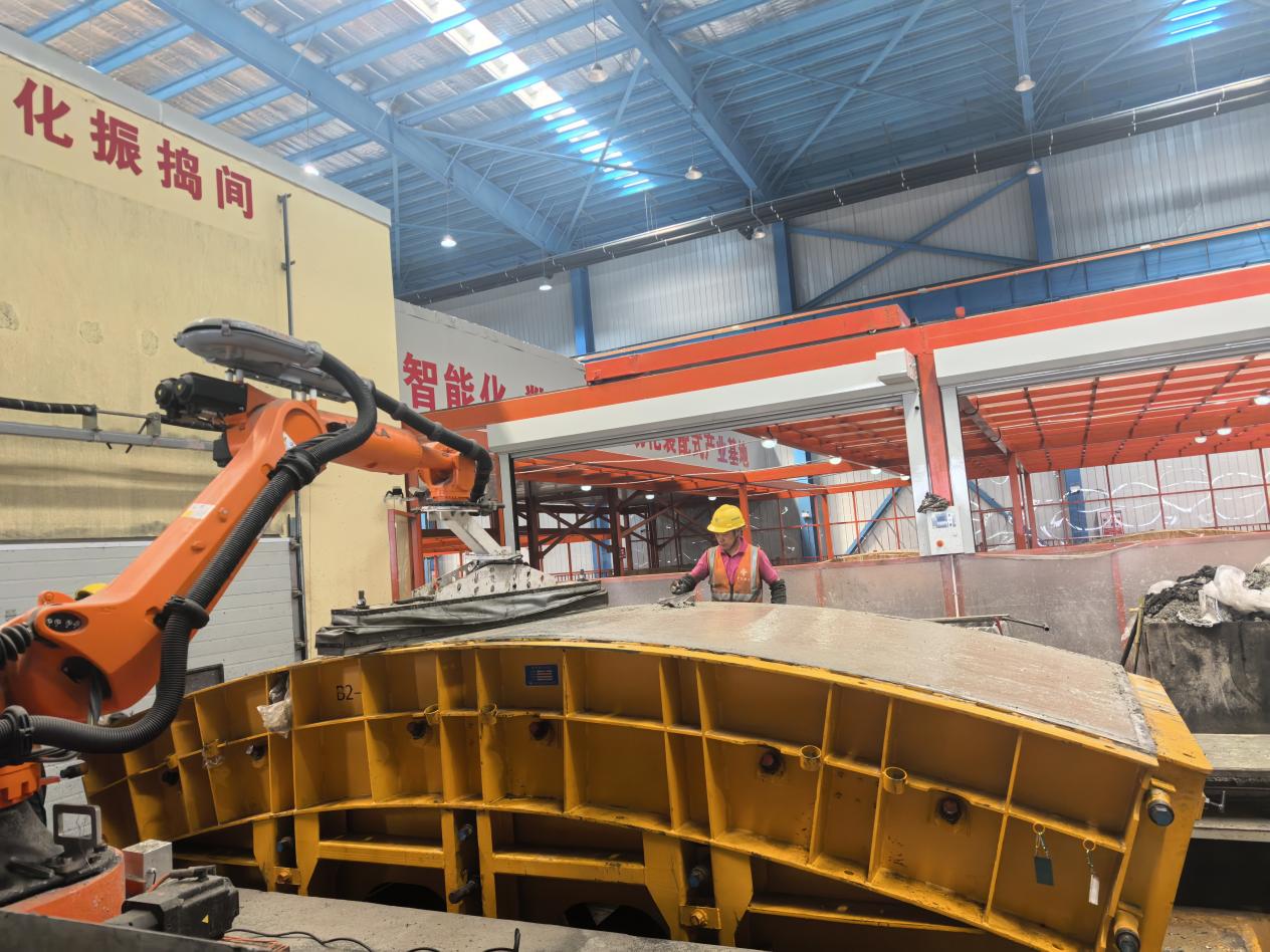 中交一公局港发建科技术品控部部门经理刘洋介绍,目前,企业应用的新型智能化盾构管片生产工艺,融合自动化与数字化技术,在模具开合、混凝土浇筑等核心工序中广泛引入多类机器人作业,构建起高效智能制造流程