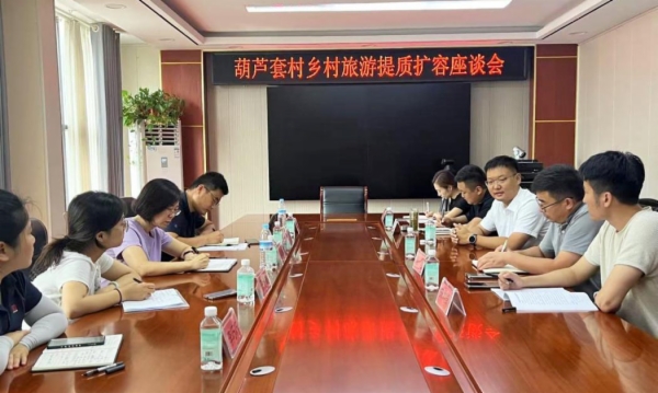 调研组首站抵达山亭区葫芦套村。葫芦套村坐落于鲁南生态腹地,自然环境优美,人文底蕴深厚。近年来,该村紧紧围绕"山水生态+红色文化"资源禀赋,积极打造"乡村旅游+"融合发展新模式,走出了一条以农促旅、以旅兴农的振兴之路。先后获评全国乡村旅游重点村、中国美丽休闲乡村等称号,拥有1家国家3A级旅游景区——葫芦套风景区。调研组实地调研了葫芦套村游客服务中心、非遗街区、研学课堂、主题民宿、生态漂流、石佛寺和无动力乐园等,深入了解了该村发展现状及乡村旅游工作的开展情况。在随后举行的座谈会上,双方围绕葫芦套村乡村旅游转型升级、新业态培育、夜间消费破题、情绪价值产品供给和闲置资源利用等议题展开务实讨论。
