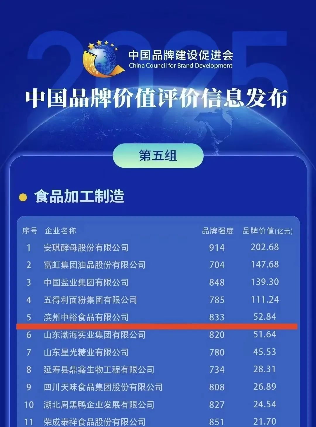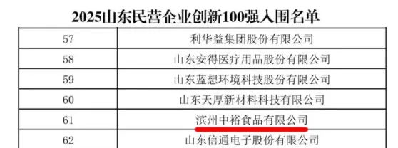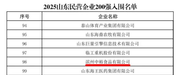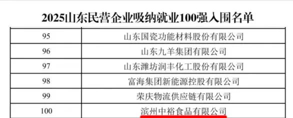 近日,2025山东民营企业百强系列榜单正式公布,滨州中裕食品有限公司在全部三个榜单成功上榜:位居“2025山东民营企业200强”第98位,“2025山东民营企业创新100强”第61位,“2025山东民营企业吸纳就业100强”第100位。