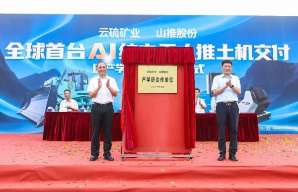 仪式上,云硫矿业与山推完成"金钥匙"交付,标志着全球首台AI纯电无人推土机正式投入使用;双方签署战略合作协议;共同为"云硫—山推产学研合作基地"揭牌。一系列仪式庄重而高效,展现出双方合作层次的不断深化。