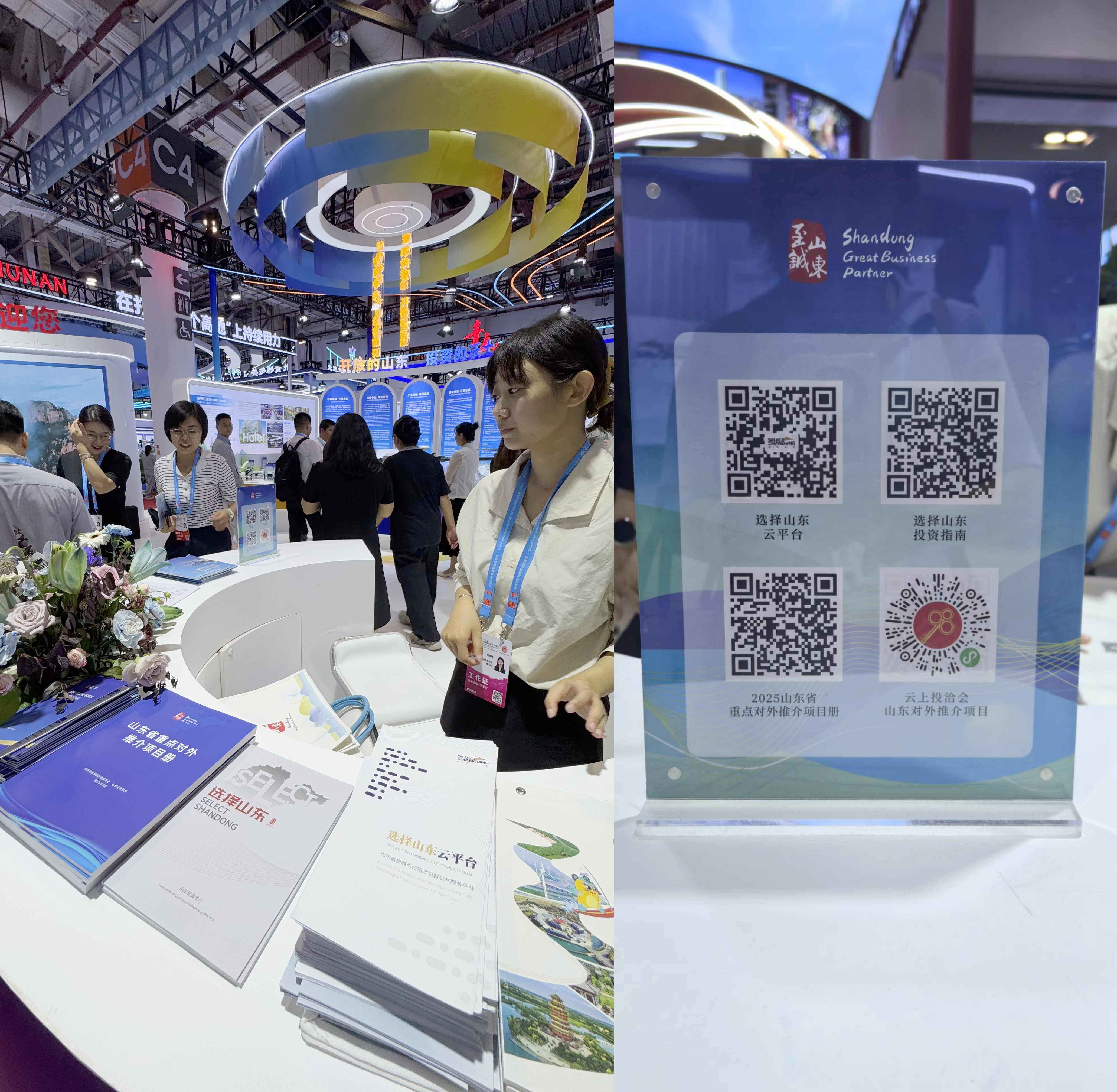 在山东展区的核心区域,“选择山东”云平台作为全省招商引资招才引智公共服务平台重磅亮相,成为推介山东、链接全球资源的重要窗口。展区内,高清大屏循环播放着“选择山东”云平台宣传片,以动态影像和丰富案例生动呈现山东的发展活力与投资机遇,吸引众多参会客商纷纷驻足观看、深入交流。现场工作人员主动向来访嘉宾发放“选择山东”云平台手册,系统介绍平台功能与服务内容,并针对客商关注的重点领域与合作意向,提供一对一的专业讲解和政策咨询。嘉宾只需轻松扫码,即可快速登录“选择山东”云平台,实时查看山东省产业布局、招商政策及重点项目信息,实现从“面对面”沟通到“屏对屏”对接的无缝衔接。