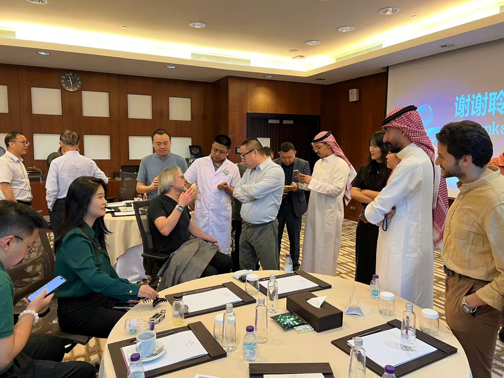 揭牌仪式当日,陕西省侨联秘书长谢小义率领的“中医暖侨团”同步开展了以“中医药文化走入沙特”为主题的义诊与文化展示活动。专家团队成员包括陕西中医药大学附属医院谭龙旺教授、第二附属医院主治医师张鸿,以及省侨联文化交流部彭洪桥主任。活动现场,专家们以针灸、推拿等传统疗法为当地民众提供诊疗服务,并结合实例讲解中医基础理论与临床应用。银杏叶等特色中药材展品也吸引众多沙特嘉宾驻足了解。