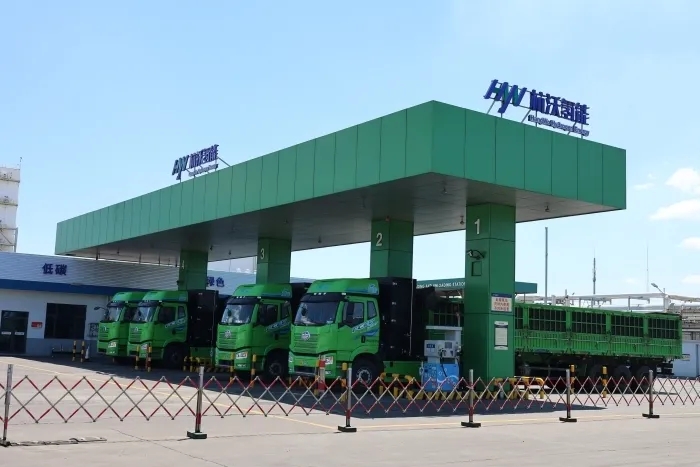 ▲晋南钢铁建设大型加氢站,为氢能重卡提供动力。这些绿色动力,全部来自企业焦炉煤气、转炉煤气、高炉煤气的提纯分离。