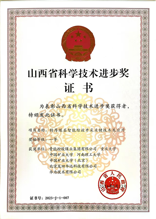 其中,“特厚煤层智能综放开采关键技术及应用”项目主要针对特厚煤层智能化综放开采条件下煤矸智能识别、智能放煤控制、“采支—放—运”系统智能协调等难题,以“智能群组放煤机理—智能放煤方法—煤矸精准识别技术—智能放煤控制技术及装备—工程示范”为主线开展相关研究,从特厚煤层综放开采群组放煤理论研究出发,建立特厚煤层采放协调智能放煤工艺模型及方法,融合煤矸识别技术,集中到智能化放煤控制关键技术和装备中,确定特厚煤层智能化综放开采的放煤工艺参数,通过工业性试验达到工程示范,进一步验证研究成果并进行推广应用,并于2023年获得山西省科技进步一等奖。