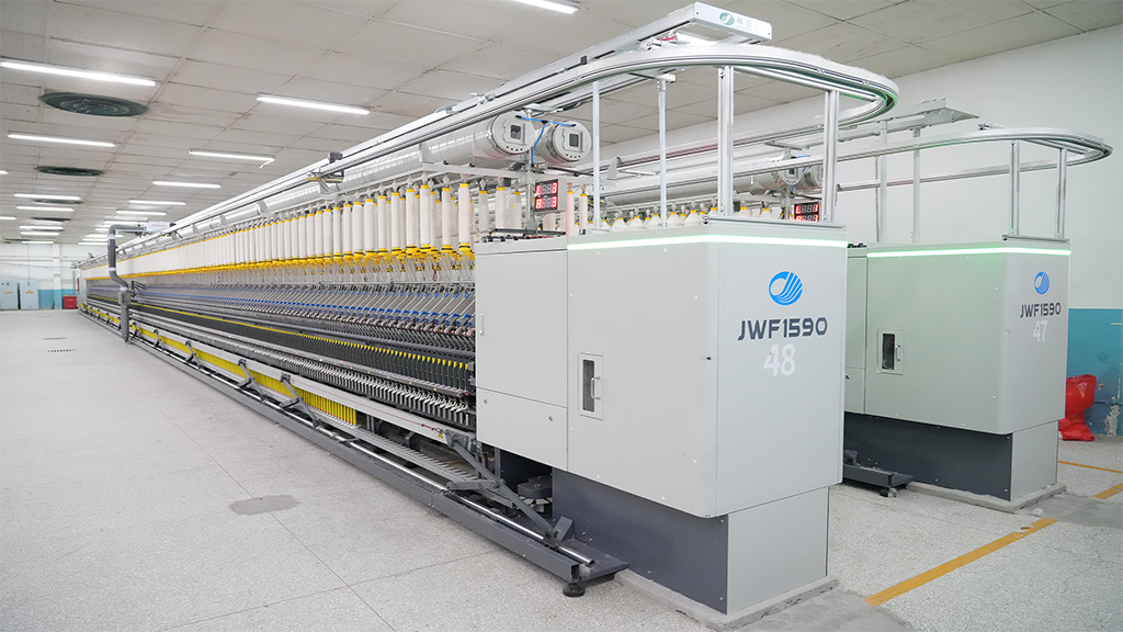 ▲JWF1590型环锭细纱机是经纬纺机根据客户的需求及环锭纺纱技术发展趋势而推出的新一代整节装配平台细纱机